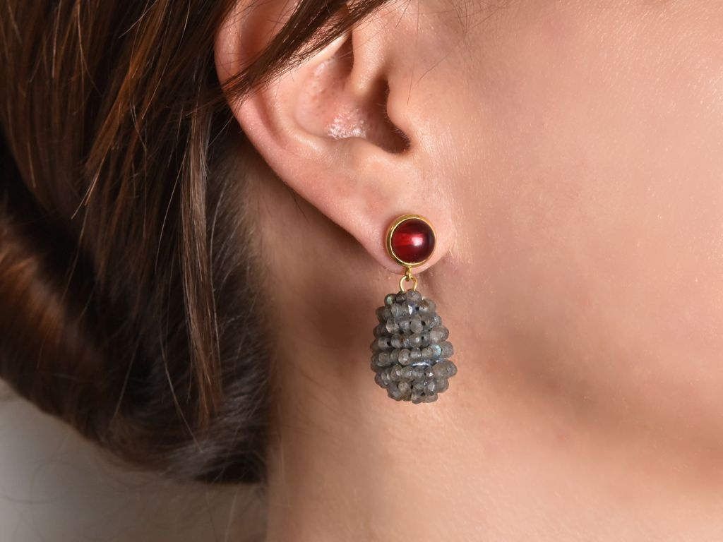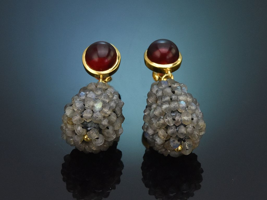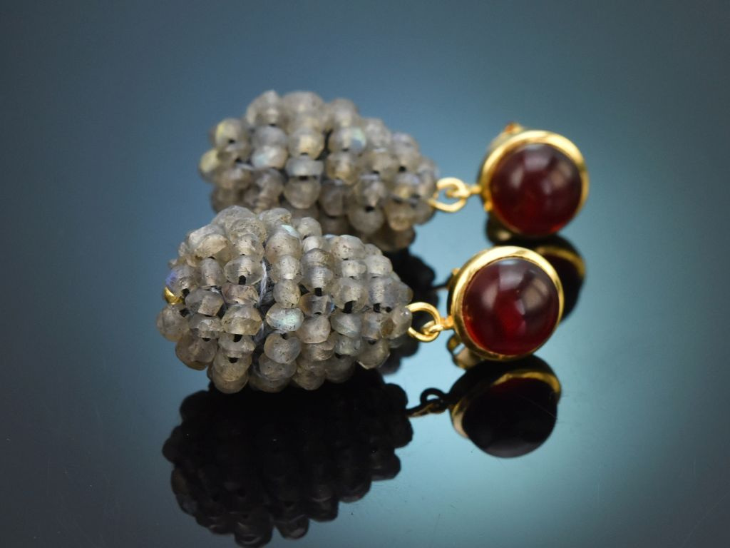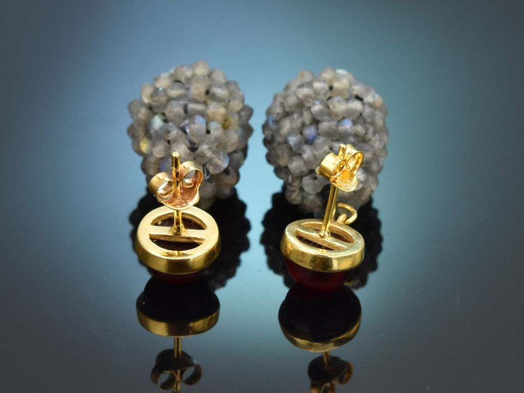 An runden Steckbrisuren, die mit einem schönen tiefroten Achat besetzt sind, schwingt je ein Tropfen aus gefädelten, facettierten Labradoritkügelchen. Praktische Butterflyverschlüsse sorgen dafür, dass der Ohrschmuck angenehm und dennoch sicher am Ohr sitzt.