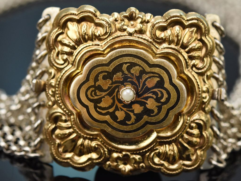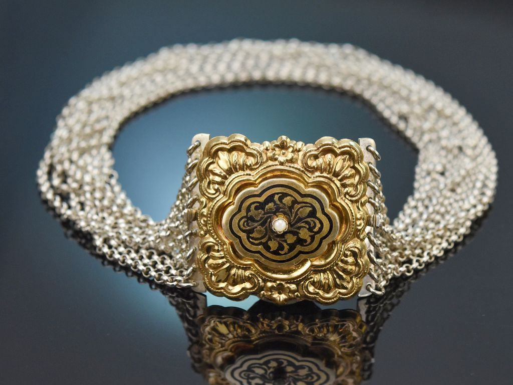 Das schöne österreichische Kropfband besteht aus neun Reihen Erbsketten, die in eine charmanten Zierschließe münden. Die quadratische Schließe besteht aus muschelförmigen Verzierungen aus vergoldetem Silber, die ein oval geschwungenes Mittelstück umrahmen. Darauf finden sich schöne florale Motive, die aus schwarzem Emaille gearbeitet sind. Eine kleine Saatperle im Zentrum rundet den opulenten Entwurf der Schließe ab.