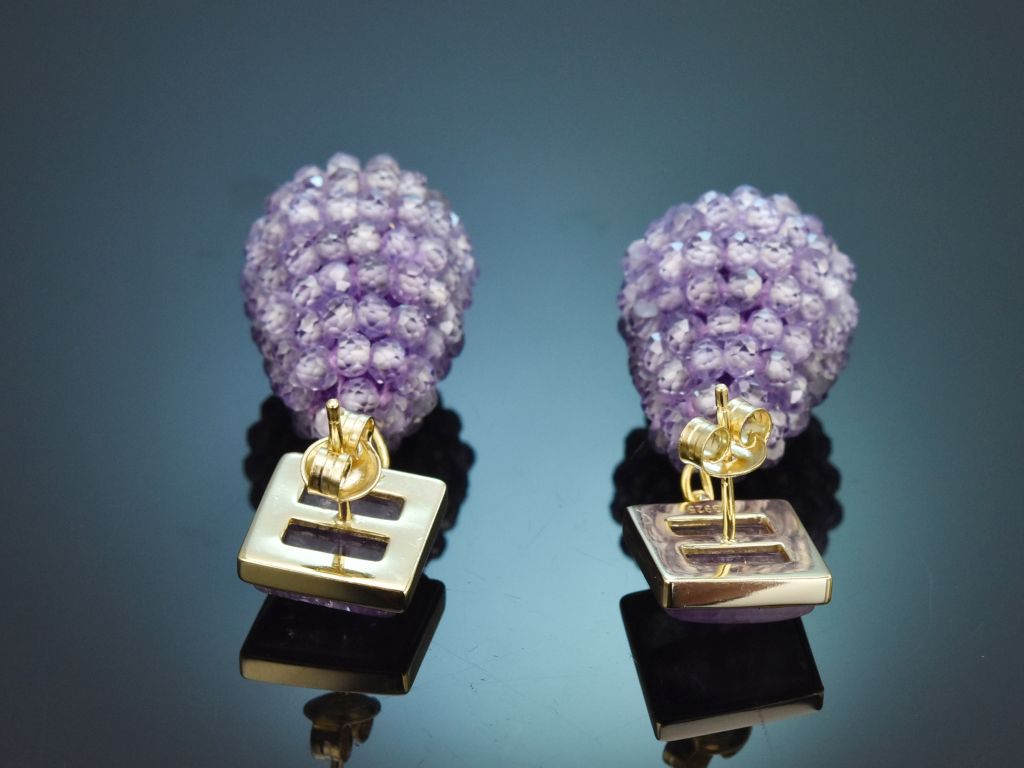 An quadratischen Brisuren, die mit fliederfarbenen Amethyst Cabochons besetzt sind, schwingt je ein Tropfen aus gefädelten, facettierten, zart violetten Amethystkügelchen, die für charmanten Glanz und lebhafte Lichtreflexe sorgen.