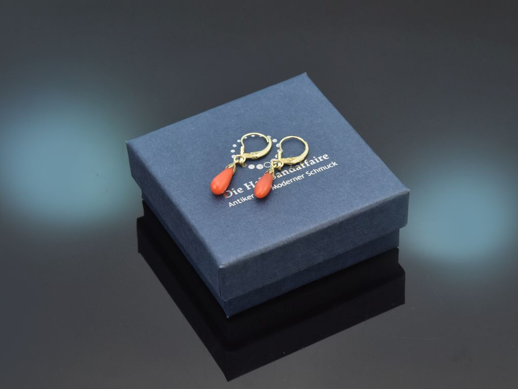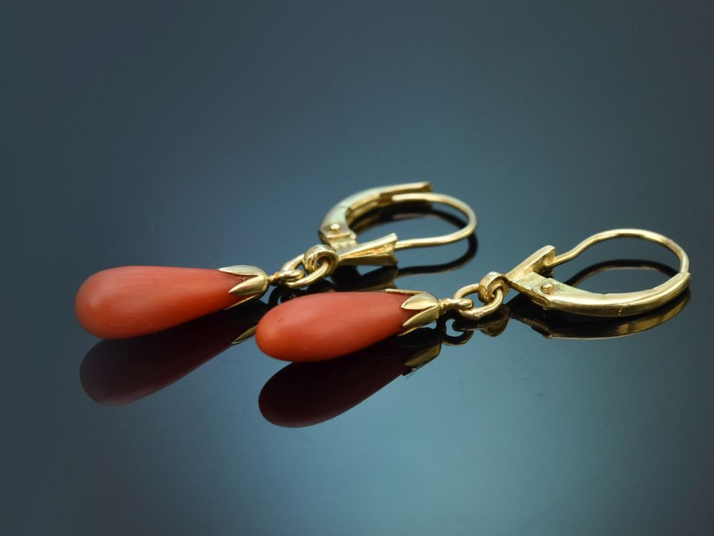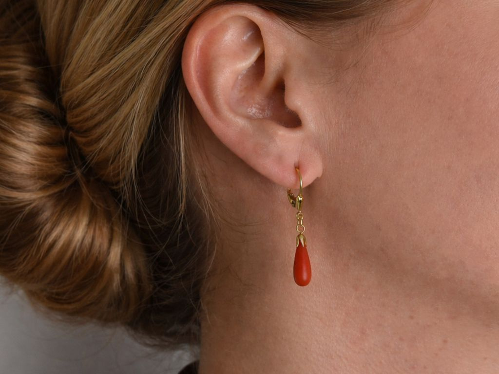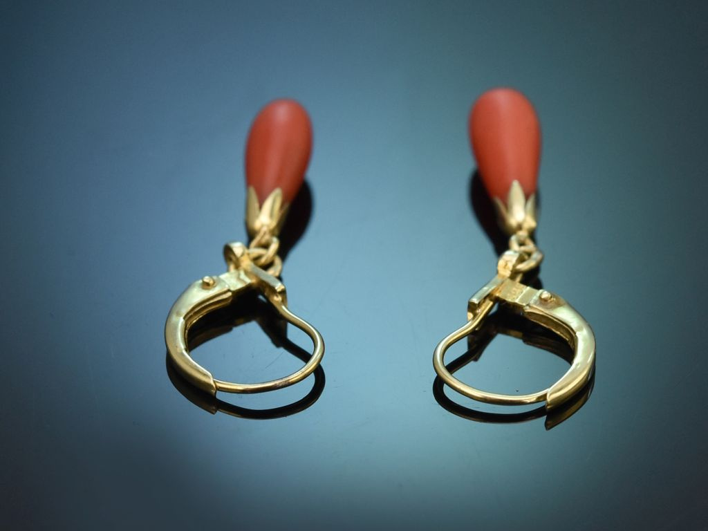An stabilen und klassischen Bügelbrisuren aus Gelbgold schwingt jeweils ein Tropfen aus roter, unbehandelter Mittelmeerkoralle. Kleine tulpenförmige Montierungen setzen einen charmanten Akzent und verbinden die Korallen mit den Brisuren.