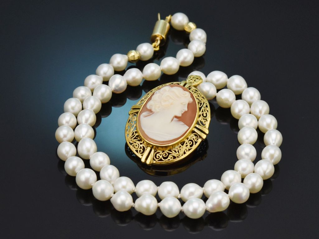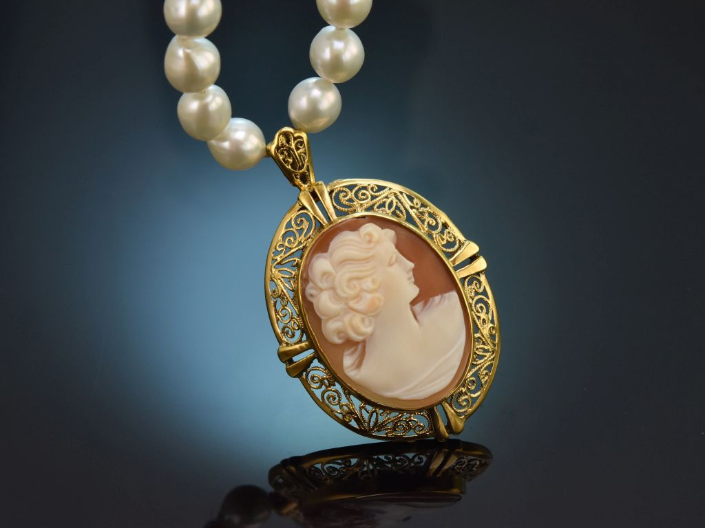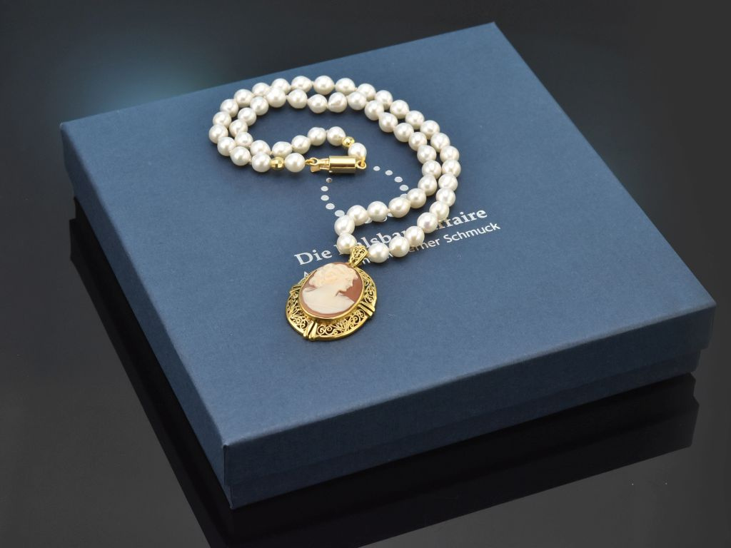 An einer eleganten Kette aus Süßwasser Zuchtperlen mit schimmerndem weißen Lüster sitzt eine fein geschnittene Muschelkamee. Die ovale Kamee zeigt eine Dame im Profil nach rechts und wird von einer filigran verzierten Rahmung aus vergoldetem Silber umfasst.