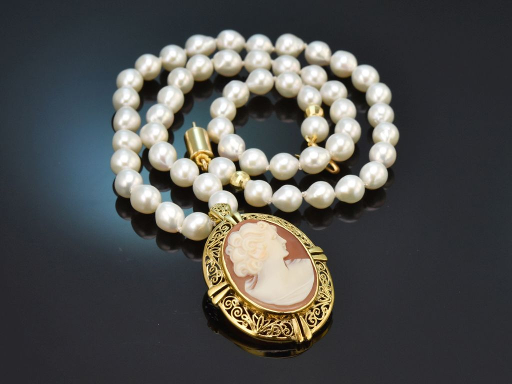 Schöne Zuchtperlenkette mit Vintage Kamee Anhänger aus vergoldetem Silber 835 (gestempelt und garantiert).