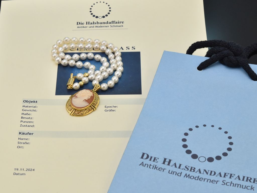 Die klassische Kamee entstand um 1950 in München und wurde in unserer Werkstatt um die handgeknüpfte Perlenkette ergänzt. So erstrahlt das Schmuckstück in ganz neuem Glanz und kann wunderbar zum klassischen Stil oder auch zur Tracht kombiniert werden.