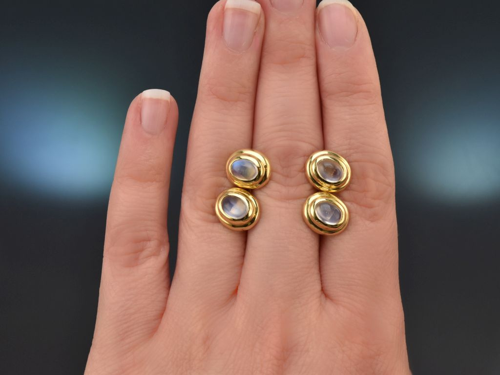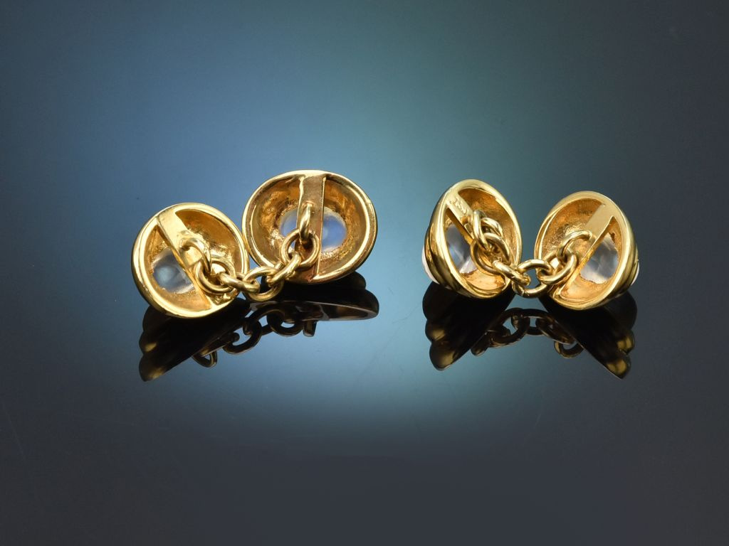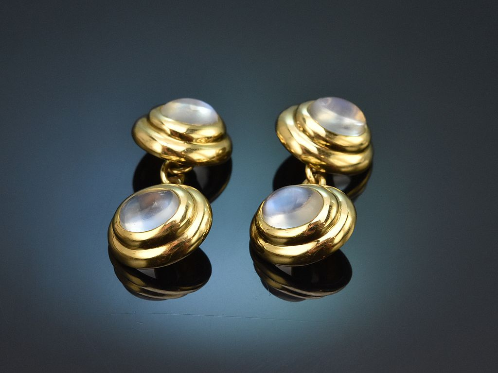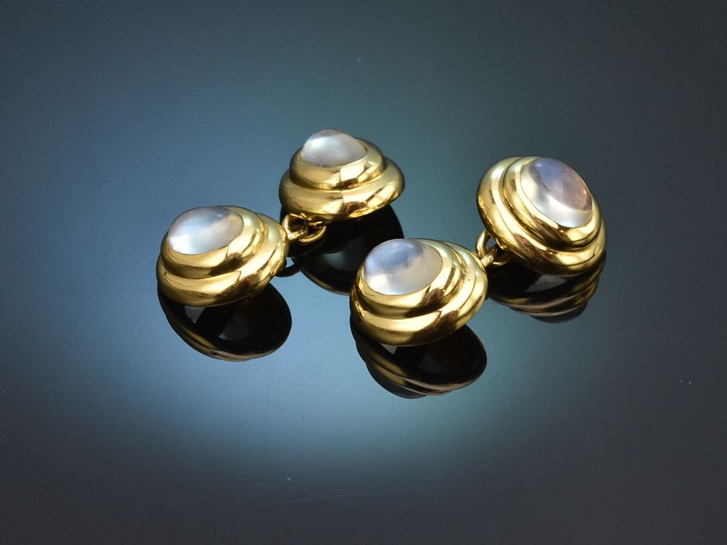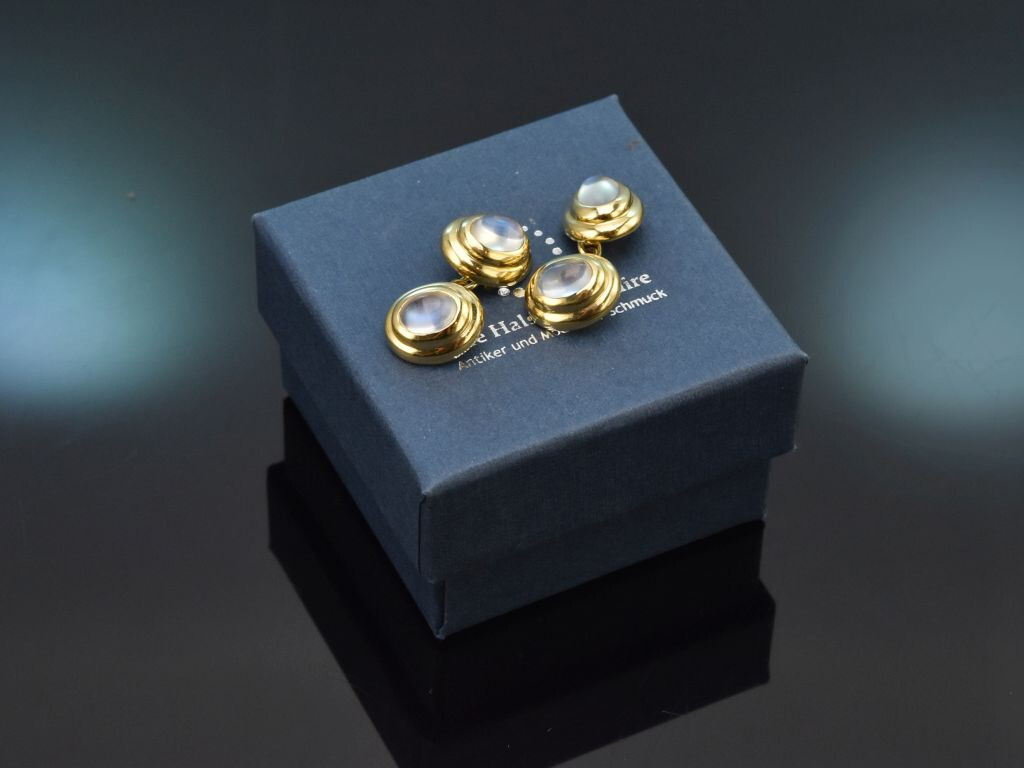 Die ovalen Knöpfe sind mit jeweils einem feinen Mondstein in Cabochonschliff besetzt. Die vier schönen Edelsteine haben ein Steingewicht von zus. ca. 3,2 Carat und zeichnen sich durch ihren charakteristischen bläulich-weichen Schimmer aus.