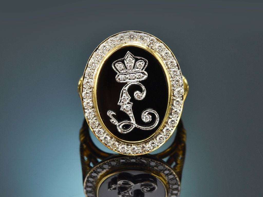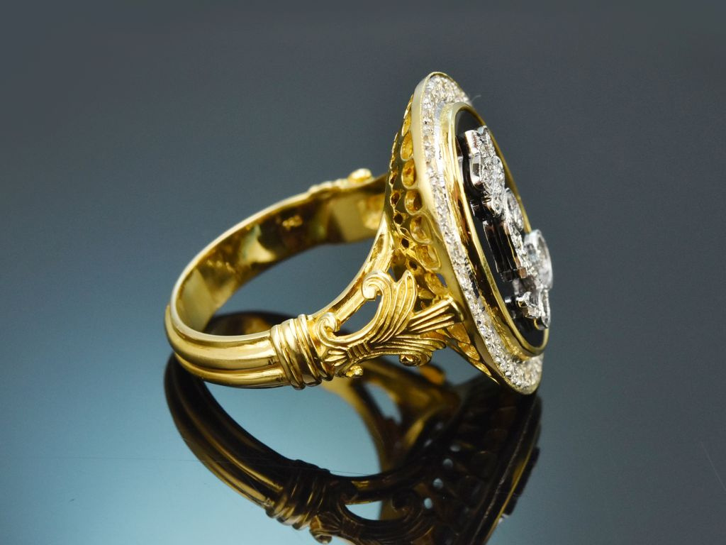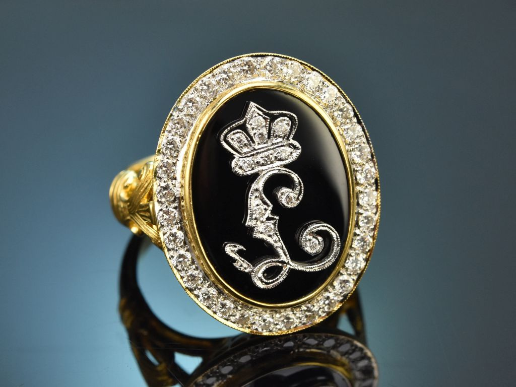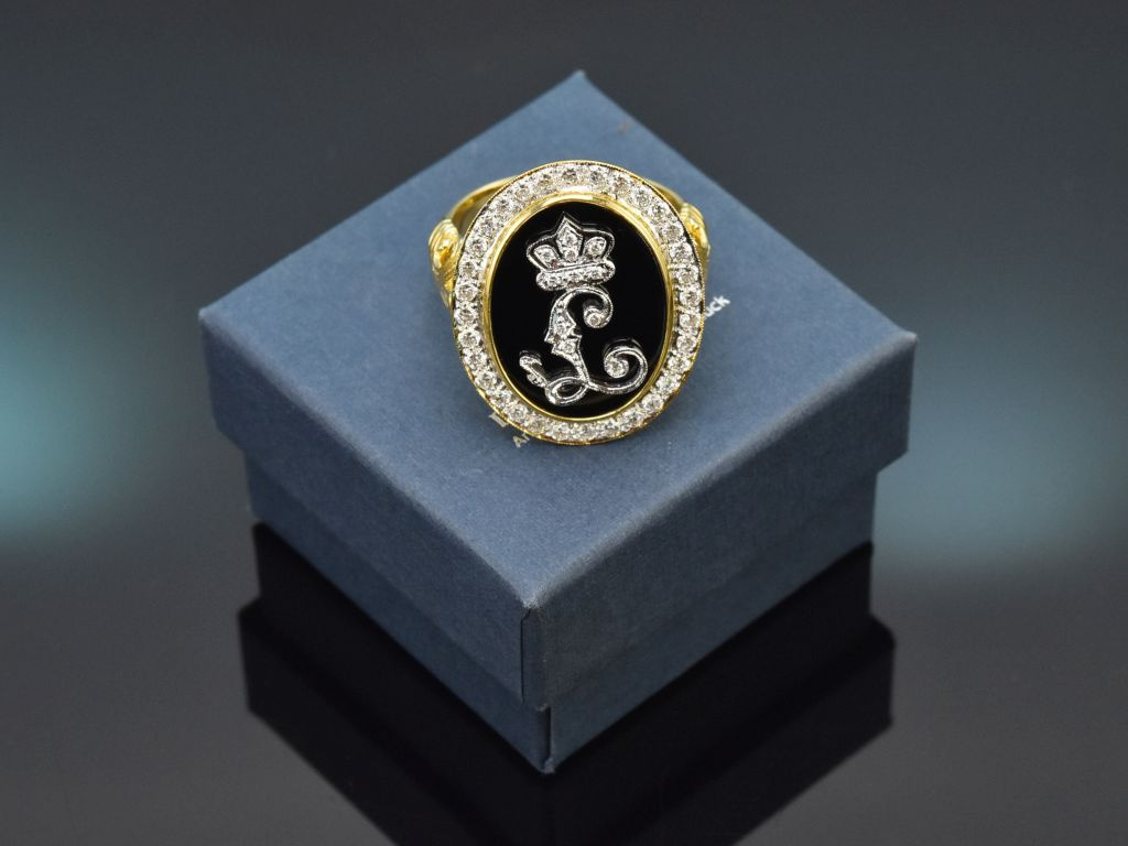 Royaler, seltener und handgearbeiteter König-Ludwig-Ring mit Onyx und Diamanten, massiv und schwer aus Gelbgold 750 / 18 Kt (gestempelt und garantiert) gearbeitet.