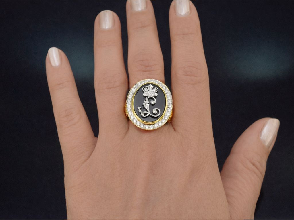 Die Mitte des großen hochovalen Ringkopfes ziert das typische bekrönte "L", das für den Märchenkönig Ludwig II. steht und aufgelegt ist auf einen tiefschwarzen Onyx in Tafelschliff. Das Monogramm mit Königskrone ist aus Weißgold gefertigt und mit 11 feinen Diamanten in Brillantschliff besetzt. Der schwarze Edelstein wird schließlich gerahmt von einem Kranz aus 32 weiteren exquisiten Brillanten, sodass das Schmuckstück auf ein Steingewicht von insgesamt ca. 1,7 Carat kommt.