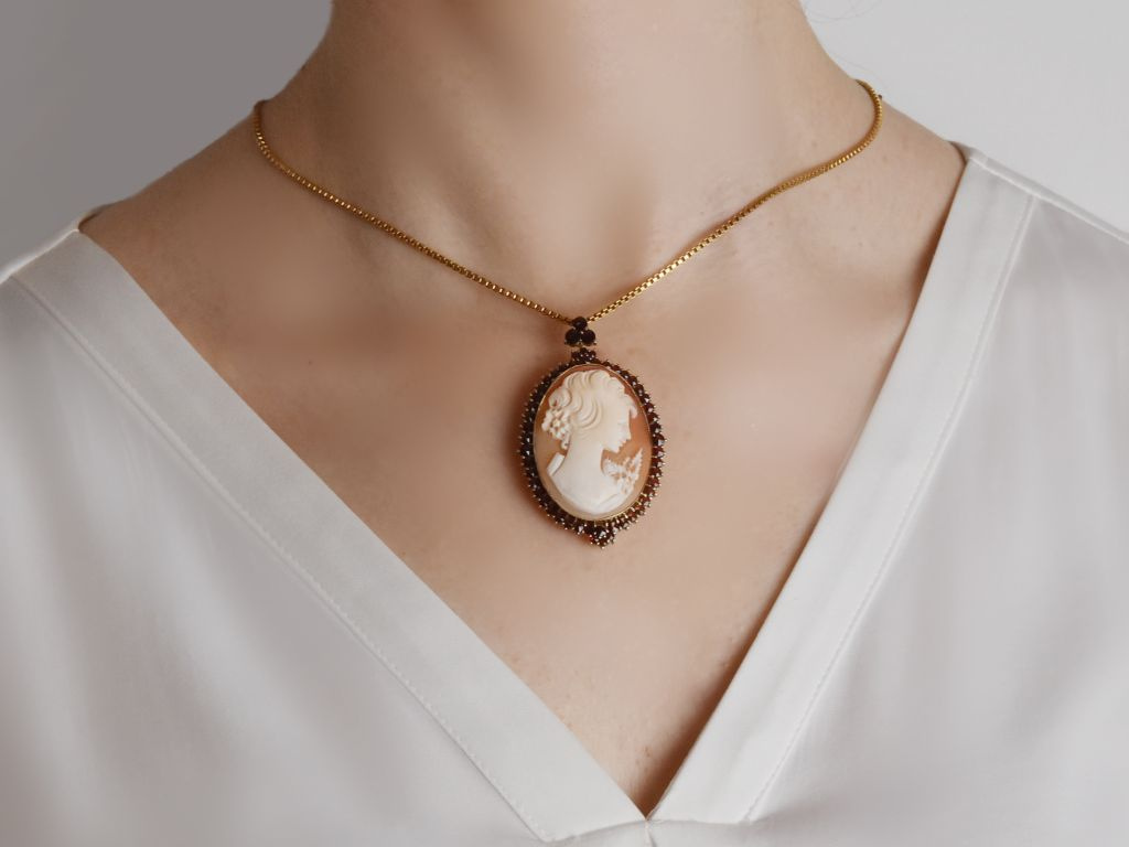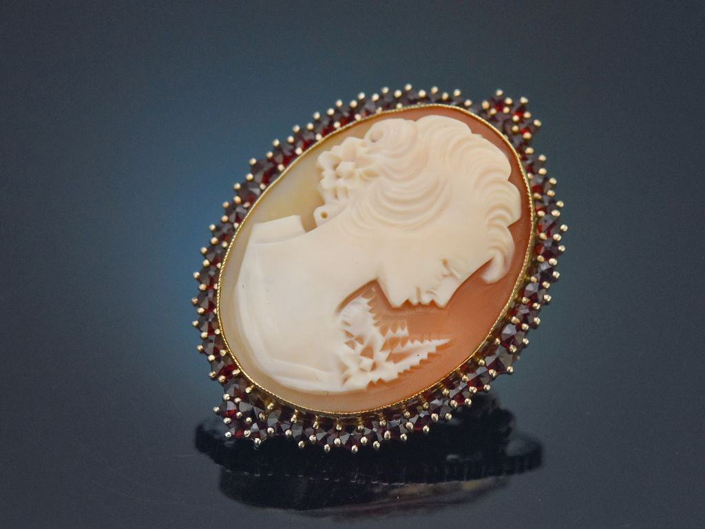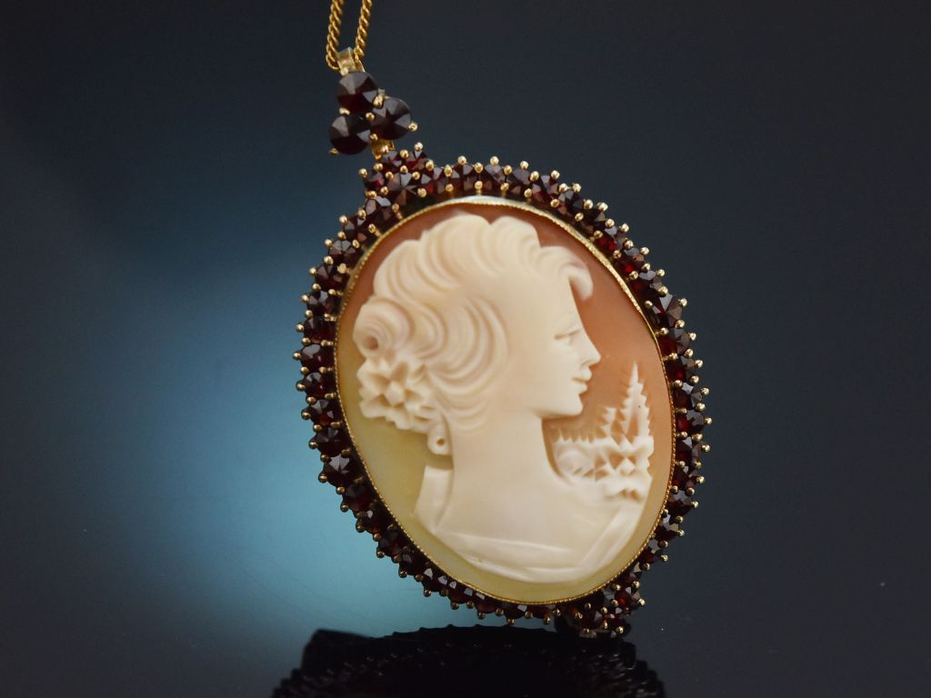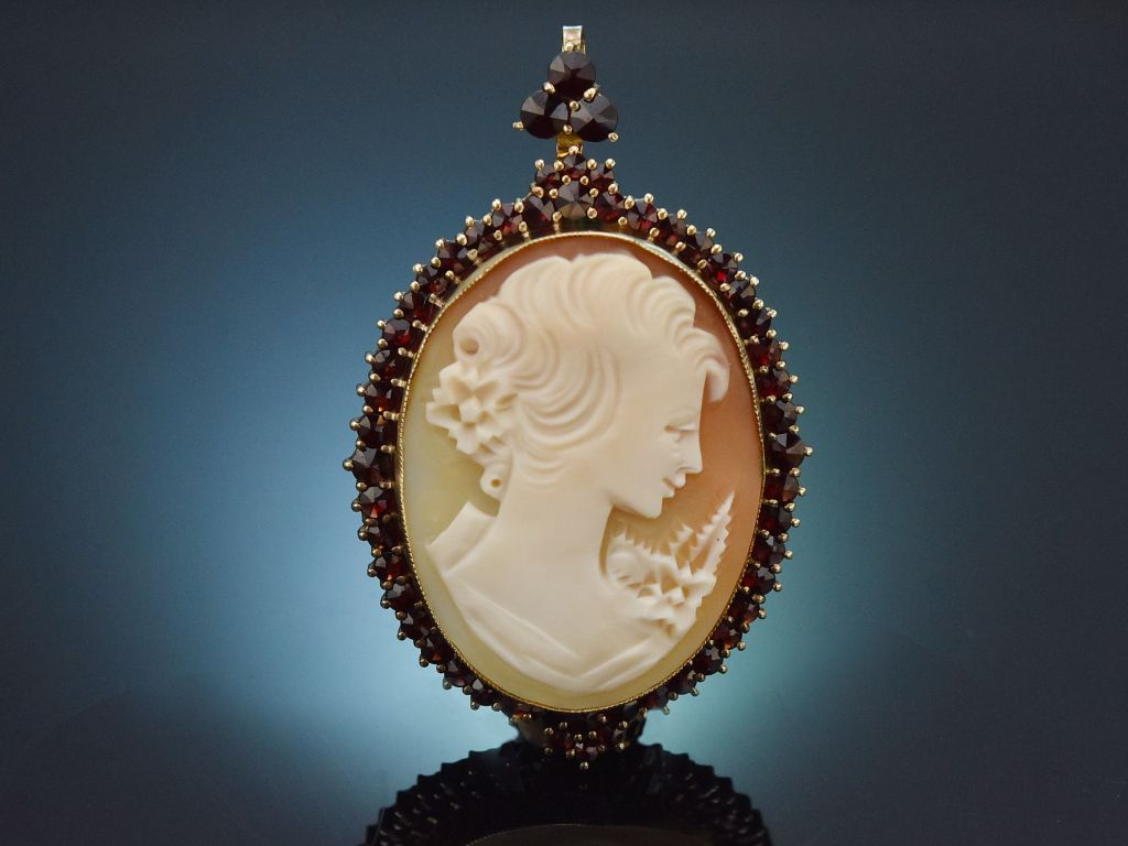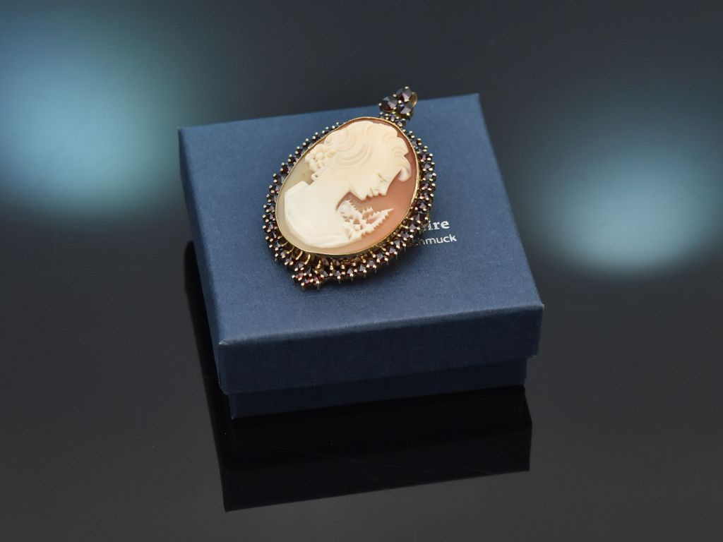 Die Umrahmung aus vergoldetem Silber, besetzt mit Granaten in Rosenschliff verleihen der Kamee ein besondere Farbkombination. Die Anhängeröse, ebenfalls mit Granat besetzt kann nach hinten geklappt werden und so verwandelt sich der Anhänger in eine Brosche.