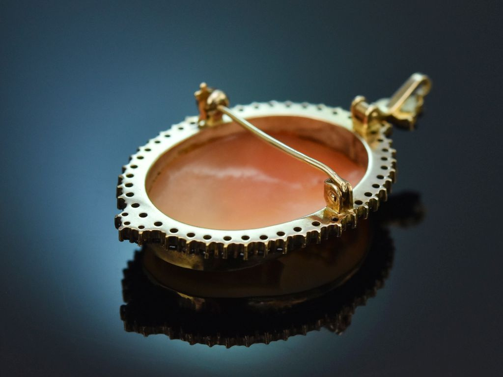 Das reizvolle Schmuckstück entstand um 1980 in München und zeigt dieselbe feine, kunstvolle Schnitttechnik, die bereits im Historismus große Wertschätzung für Kameen dieser Art begründete.