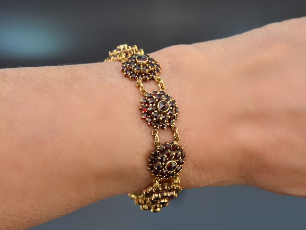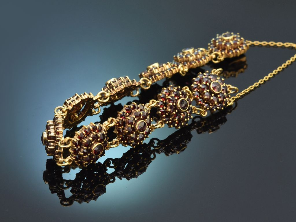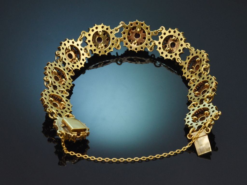 Das wunderschön funkelnde Armband besteht aus zehn rosettenförmigen Gliedern, in denen sich jeweils um eine mittig platzierte Granatrose zwei Reihen weiterer funkelnder Granatrosen reihen. Die runden Glieder sind durch Ösen beweglich miteinander verbunden und legen sich dadurch angenehm um das Handgelenk. Ein unsichtbar integriertes Kastenschloss sowie eine Sicherungskette garantieren zudem einen sicheren Halt.