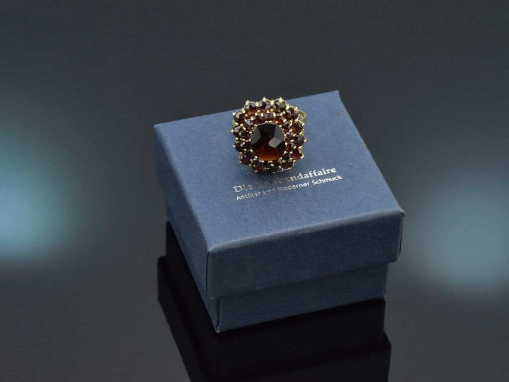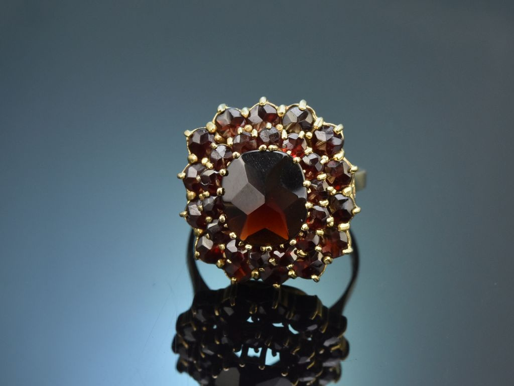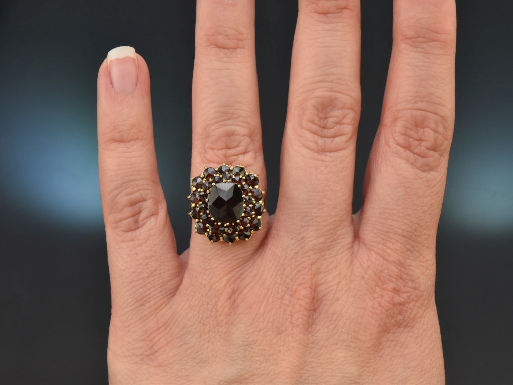Der Ringkopf ist besetzt mit einem großen Granat in Ovalschliff. Dieser ist gerahmt von zwei Reihen zu je 14 Granaten die treppenartig nach oben zum Hauptstein führen und diesen besonders schön einfassen. Eine schlichte Ringschiene aus Gelbgold rundet den Entwurf klassisch ab.