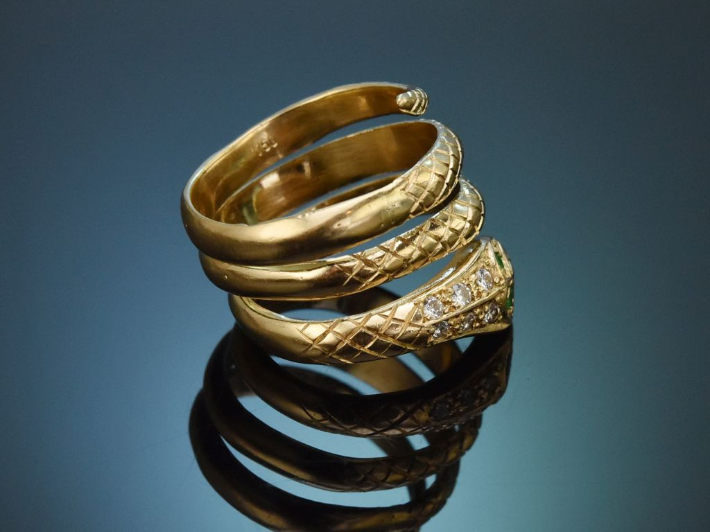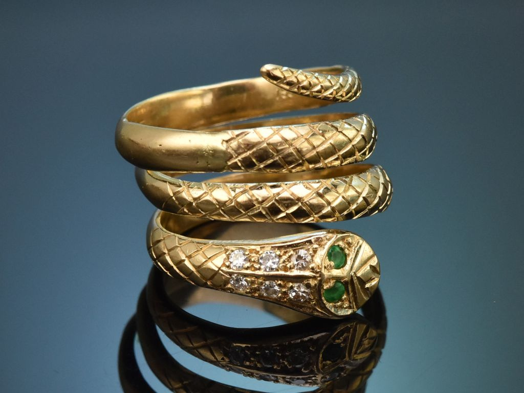 Schwerer massiver Vintage Schlangenring mit Smaragden und Diamanten, gearbeitet aus Gelbgold 750 /18 Kt (gestempelt und garantiert).
