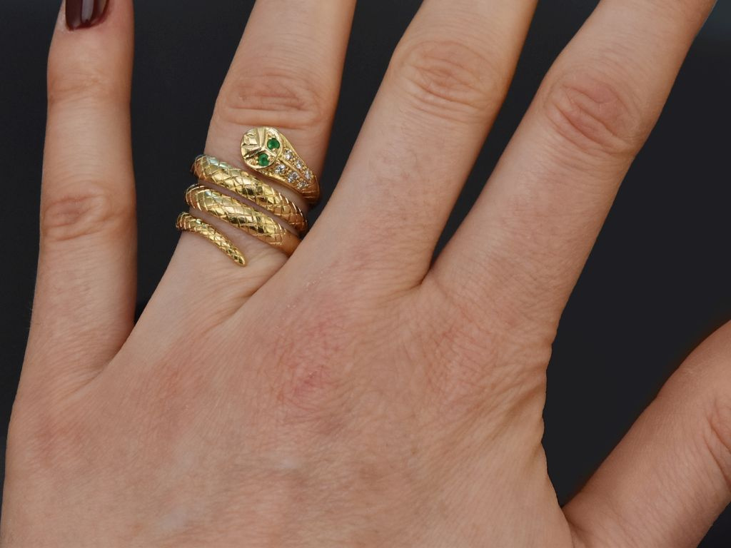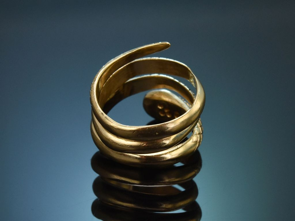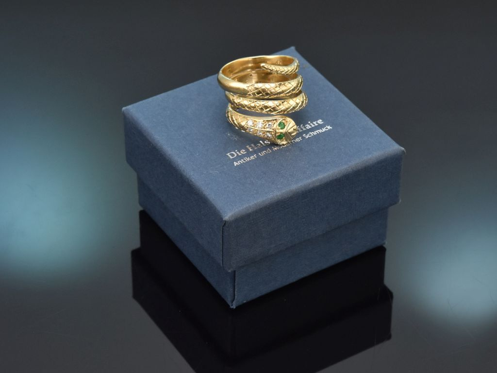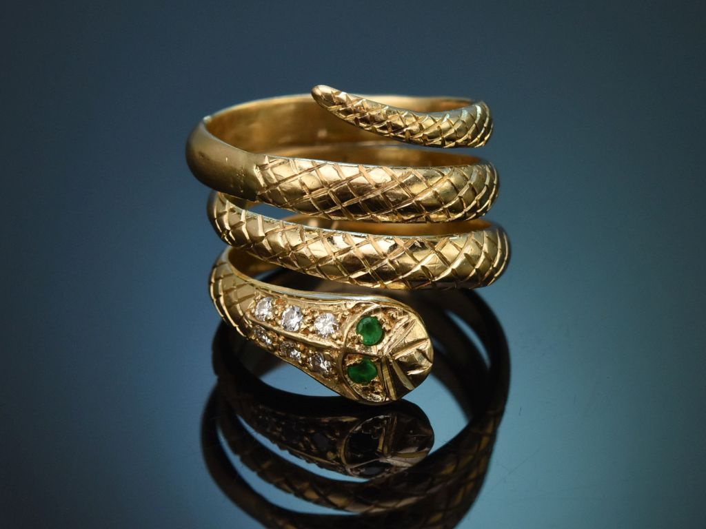 Der massive goldene Ring besteht aus einer sich um den Finger der Trägerin windenden Schlange mit schauseitigem Schuppenornament. Zwei leuchtend grüne Smaragde mit einem Steingeweicht von zus. ca. 0,04 Carat bilden die Augen des Reptils, während sechs funkelnde Diamanten in Brillantschliff kunstvoll in den Schlangenkopf eingearbeitet sind. Die Brillanten kommen auf ein Steingewicht von zus. ca. 0,12 Carat (G-H, VS1-VS2).