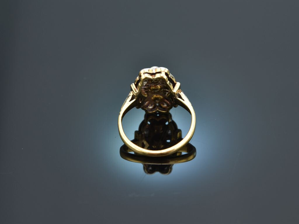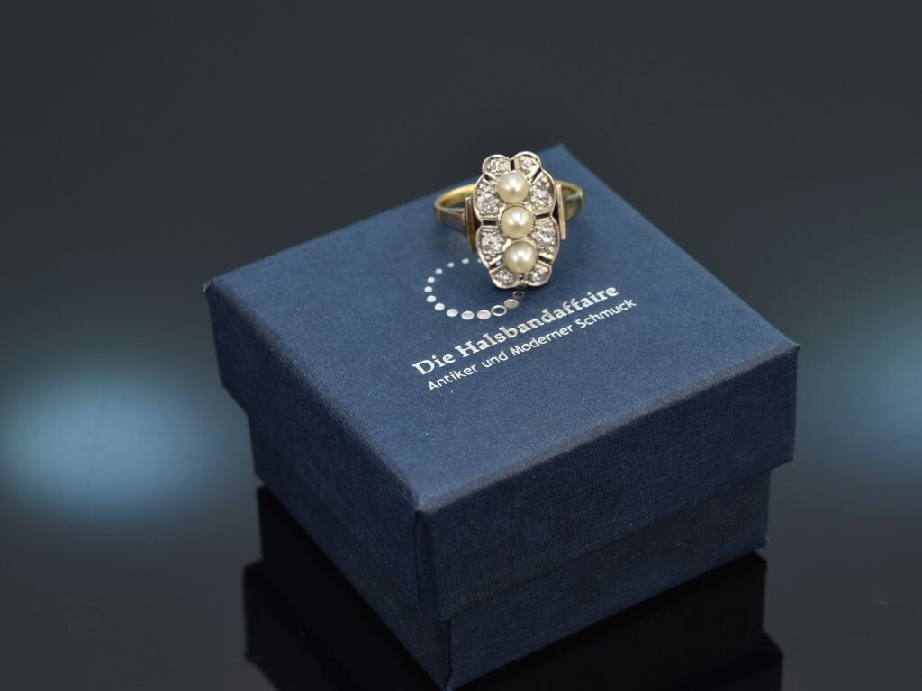 Charmanter historischer Ring mit Diamanten und Orientperlen, gearbeitet aus Gelbgold 585/ 14 Kt (gestempelt und garantiert).