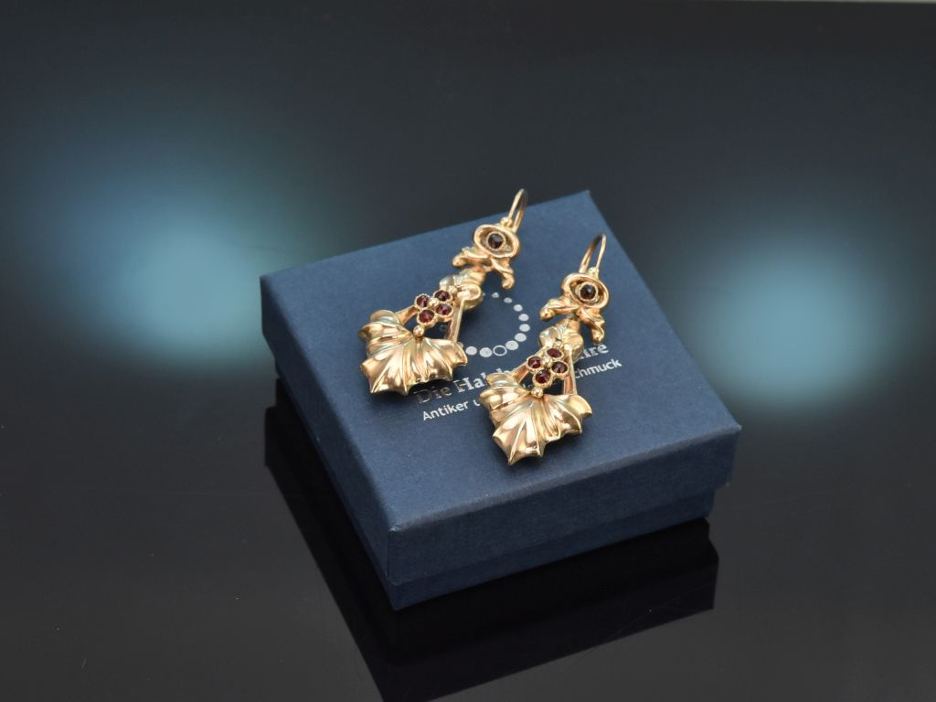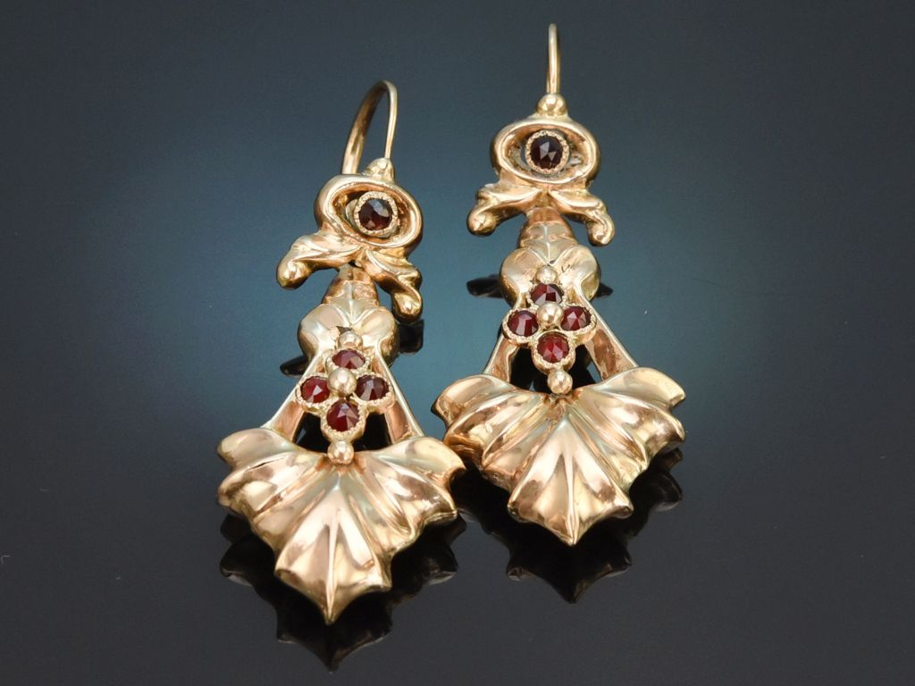 Die großen Ohrhänger besitzen nach vorne zu öffnende Wiener Brisuren, die mit je einem Granat in vegetabiler Rahmung dekoriert sind. Daran schwingt je ein großes abnehmbares und spitz zulaufendes Zierelement, das an ein stilisiertes Akanthusblatt erinnert. Insgesamt setzen acht weitere Granate in Rosenschliff schöne weinrote Akzente.