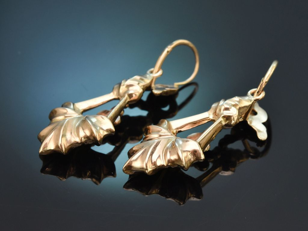 Die historischen Ohrringe entstanden um 1860 und stammen aus Österreich. Typisch für ihre Entstehungszeit sind sie hohl angefertigt und dadurch leicht aber gleichzeitig sehr hochwertig verarbeitet, sodass sie trotz ihrer Größe angenehm zu tragen sind.