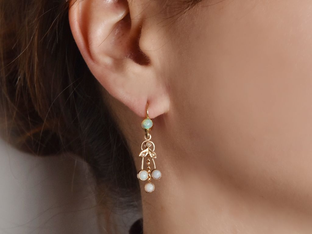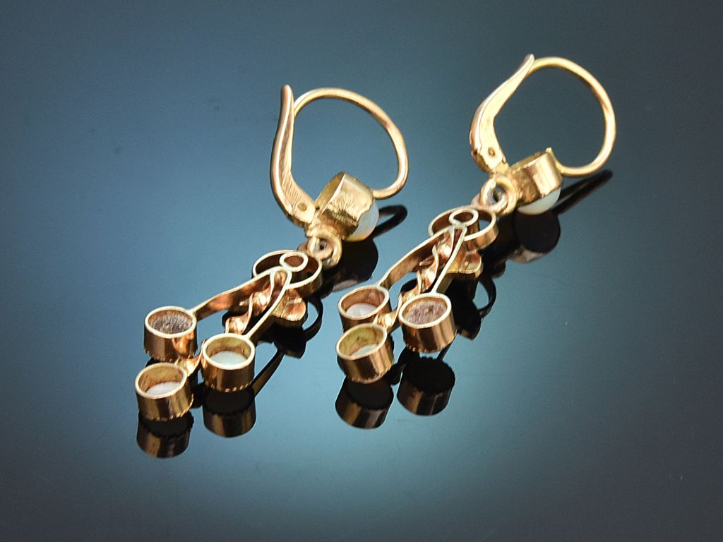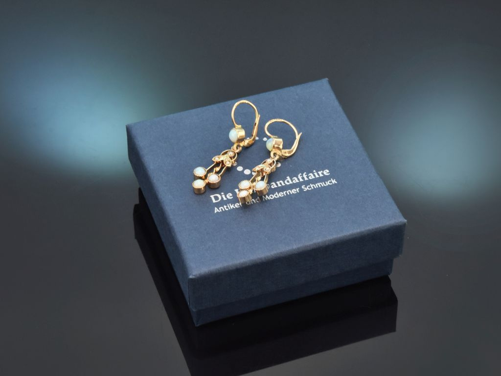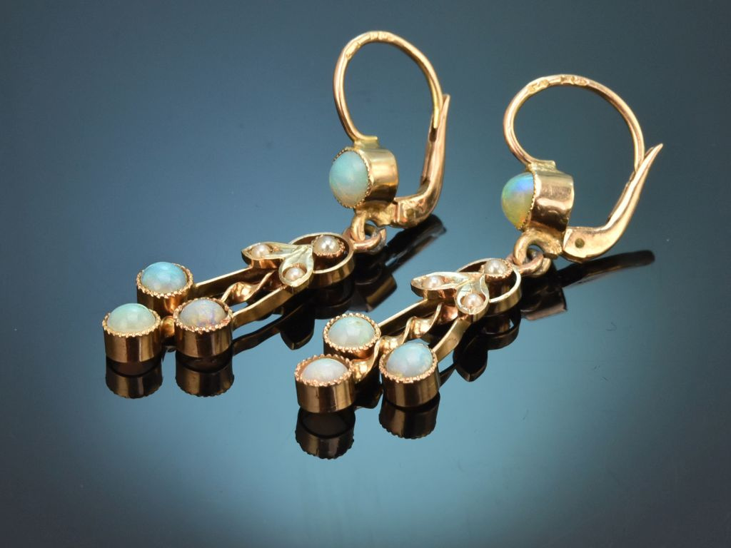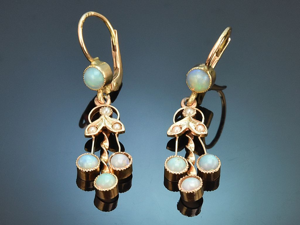 Historische Ohrringe aus Österreich, mit Opalen und Saatperlen, gearbeitet aus Gold 585 / 14 Kt (gestempelt und garantiert).
