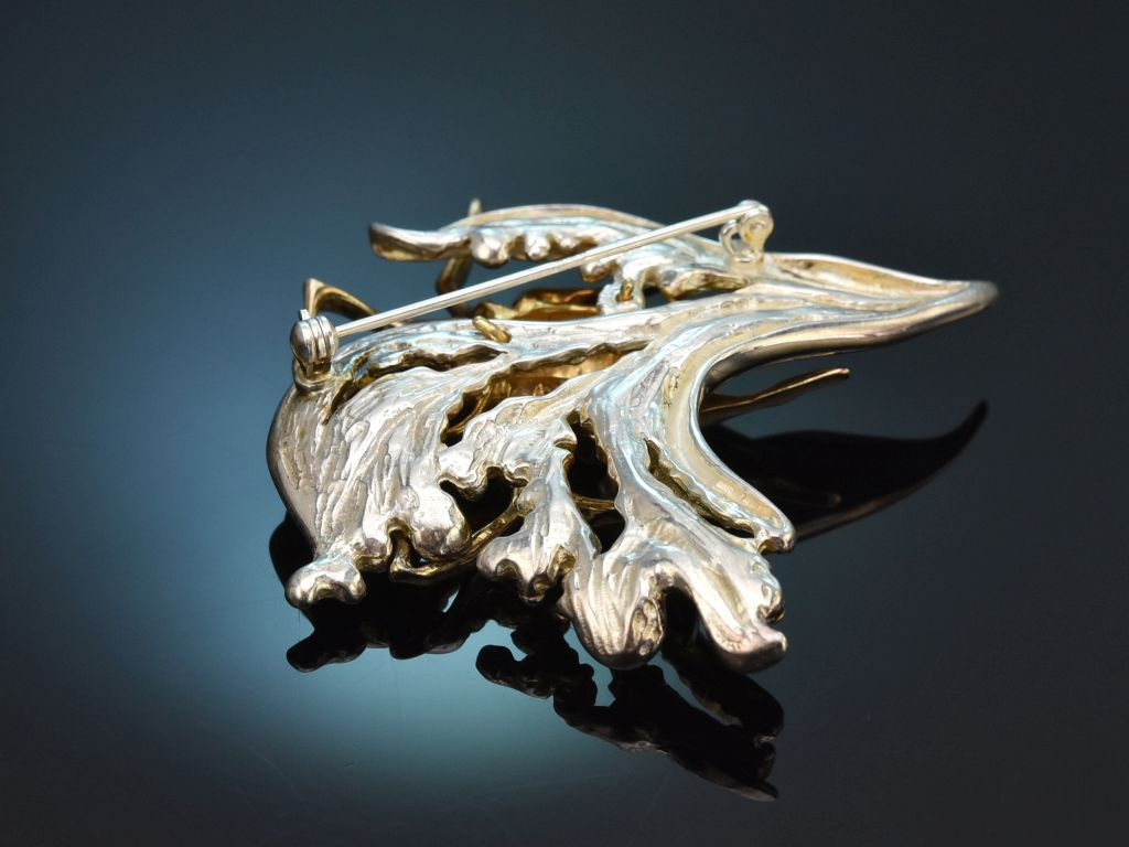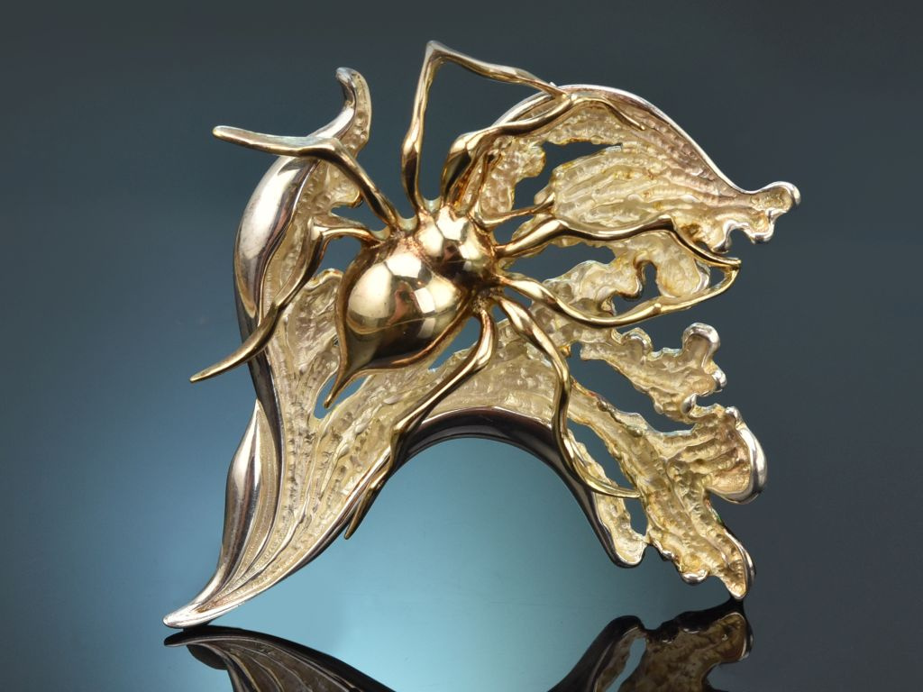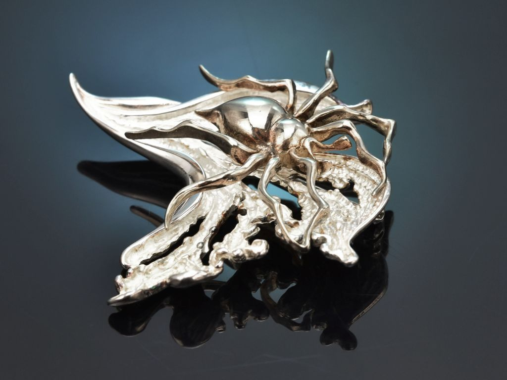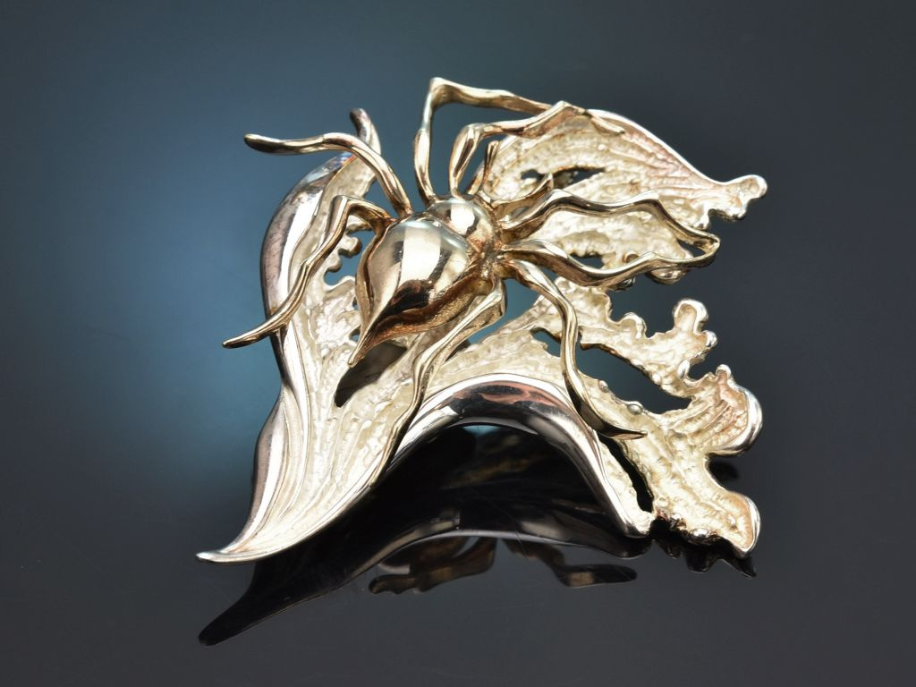 Die ungewöhnliche Brosche besteht aus einem naturalistisch gearbeiteten Blatt, auf dem eine große, zart vergoldete Spinne sitzt. Das Blatt weist innenseitig eine kunstvolle Mattierung auf, die plastische Spinne hingegen ist glänzend poliert und zart vergoldet, wodurch sie sich gut von der Blattstruktur abhebt.