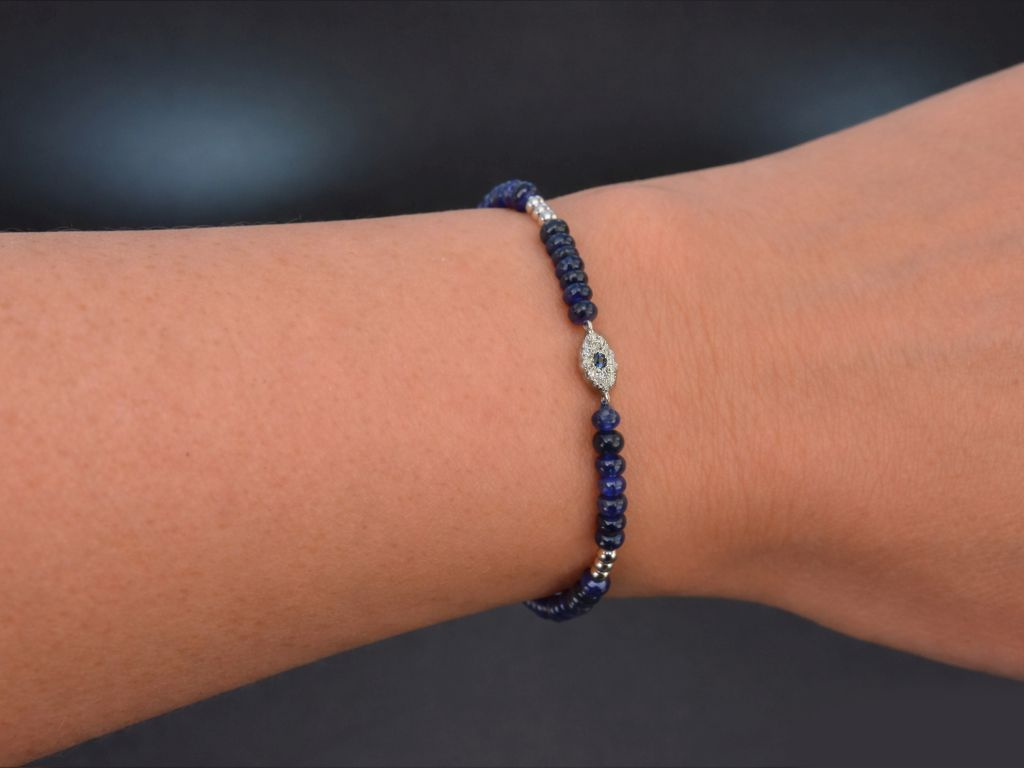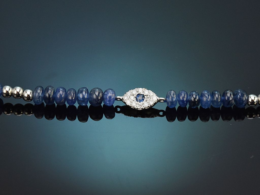 Das Armband besteht aus polierten, fein blauen Saphirlinsen, die in einem zarten, spitzovalen Mittelstück aus Weißgold mit Diamantbesatz enden. In dessen Zentrum setzt auch noch ein kleiner, rund facettierter Saphir einen hübschen Akzent. Sehr passend sind auch die Zierkugeln aus Weißgold, die in einem symmetrischen Abstand zur Mitte eingearbeitet sind. Die Saphire haben alle zusammen ein Steingewicht von 14,8 Carat, die 14 Diamanten in Brillantschliff kommen zusammen auf 0,08 Carat und liegen im schönen Qualitätsbereich (G-H, SI1).