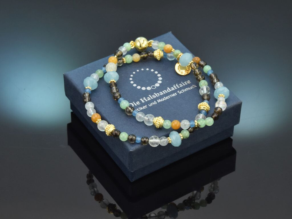 Hübsches zweireihiges Fancy Armband aus Aquamarin, Aventurin, Achat, Chrysopras und Rauchquarz und vergoldetem Sterlingsilber 925 (gestempelt und garantiert).