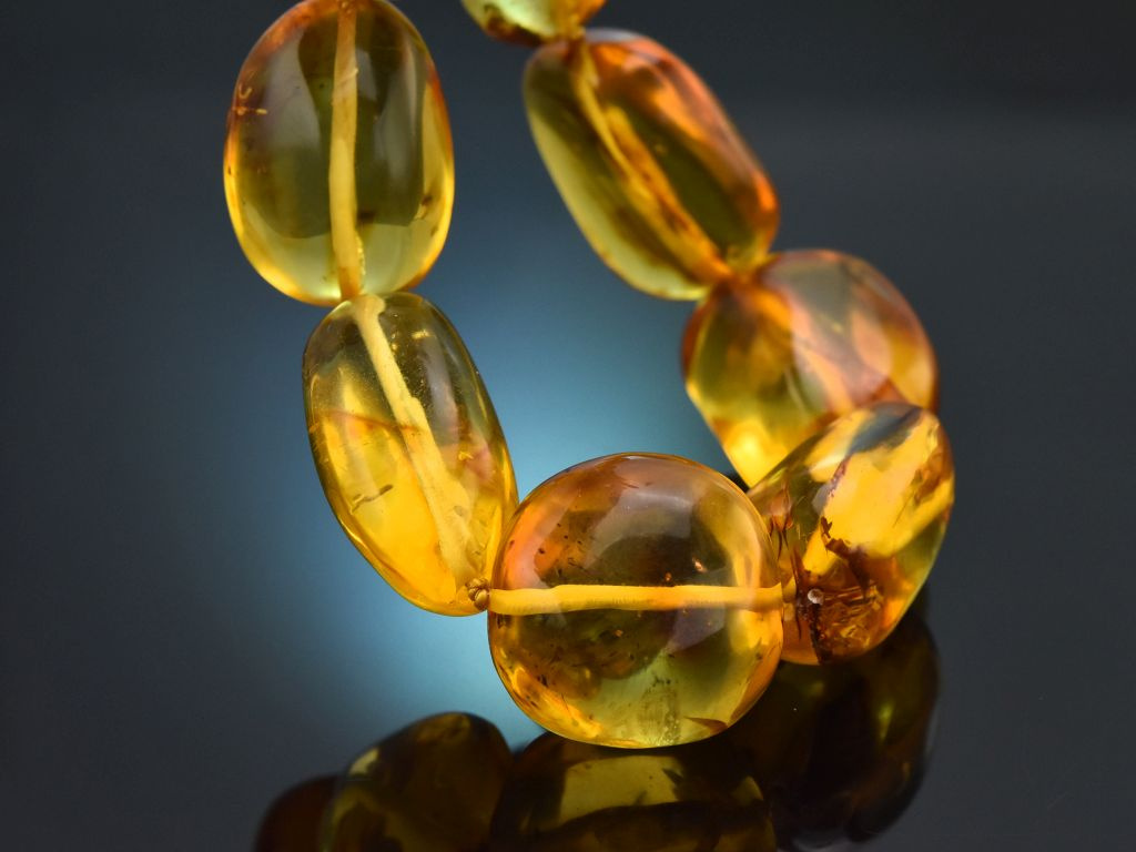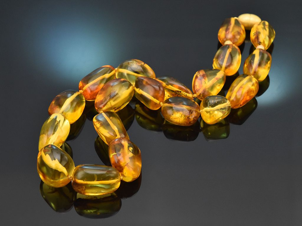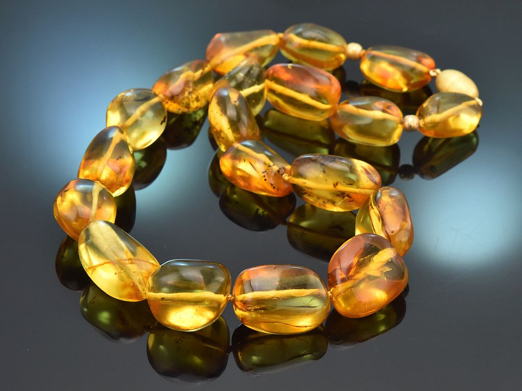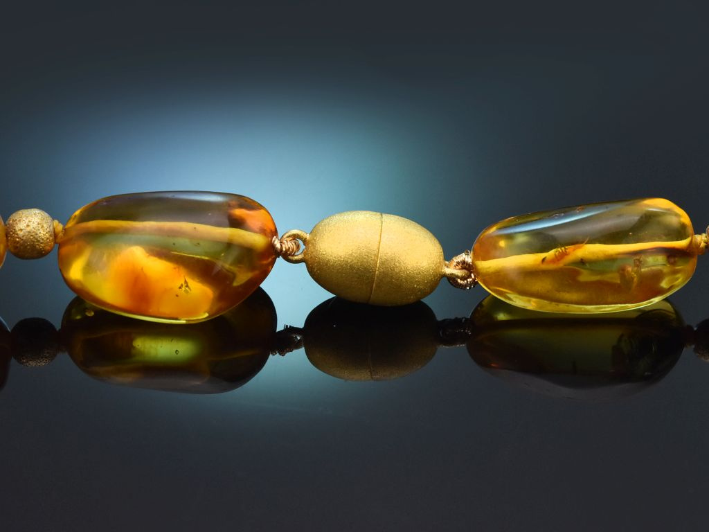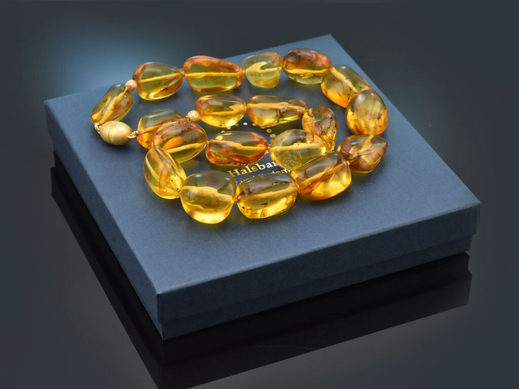 Die wundervolle Kette besteht aus großen, leicht unregelmäßigen, ovalen bis runden Bernsteinen, die in einer olivenförmigen, satinierten Magnetschließe aus vergoldetem Silber münden. Die leuchtend honigfarbenen Bernsteine bezaubern durch ihre eindrucksvolle Größe, durch die interessanten Einschlüsse aus Moosen, Flechten und anderen Pflanzen und durch ihre warme Farbe.