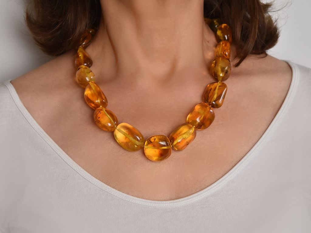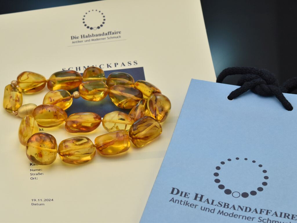 Unsere imposante Kette wurde in unserer Werkstatt von Hand liebevoll neu geknüpft und ist ein dekoratives Schmuckstück mit Millionen Jahre alter Geschichte.