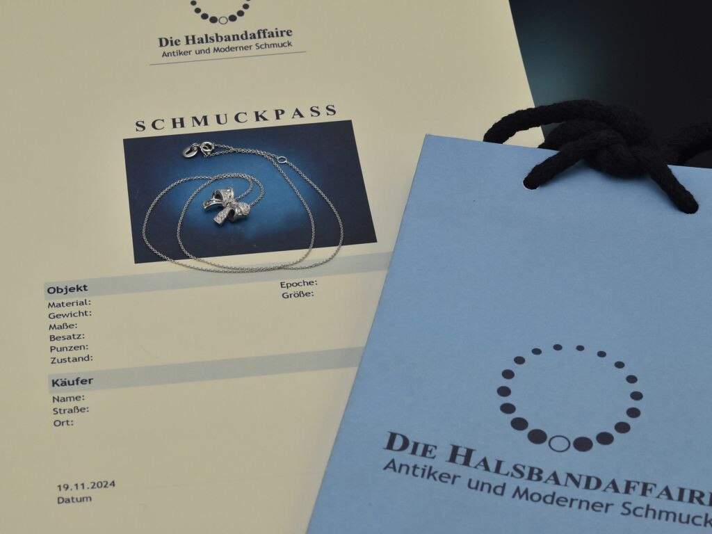 Sie erhalten das Collier liebevoll verpackt in einem unserer hochwertigen Etuis und mit Echtheitsgarantiezertifikat.