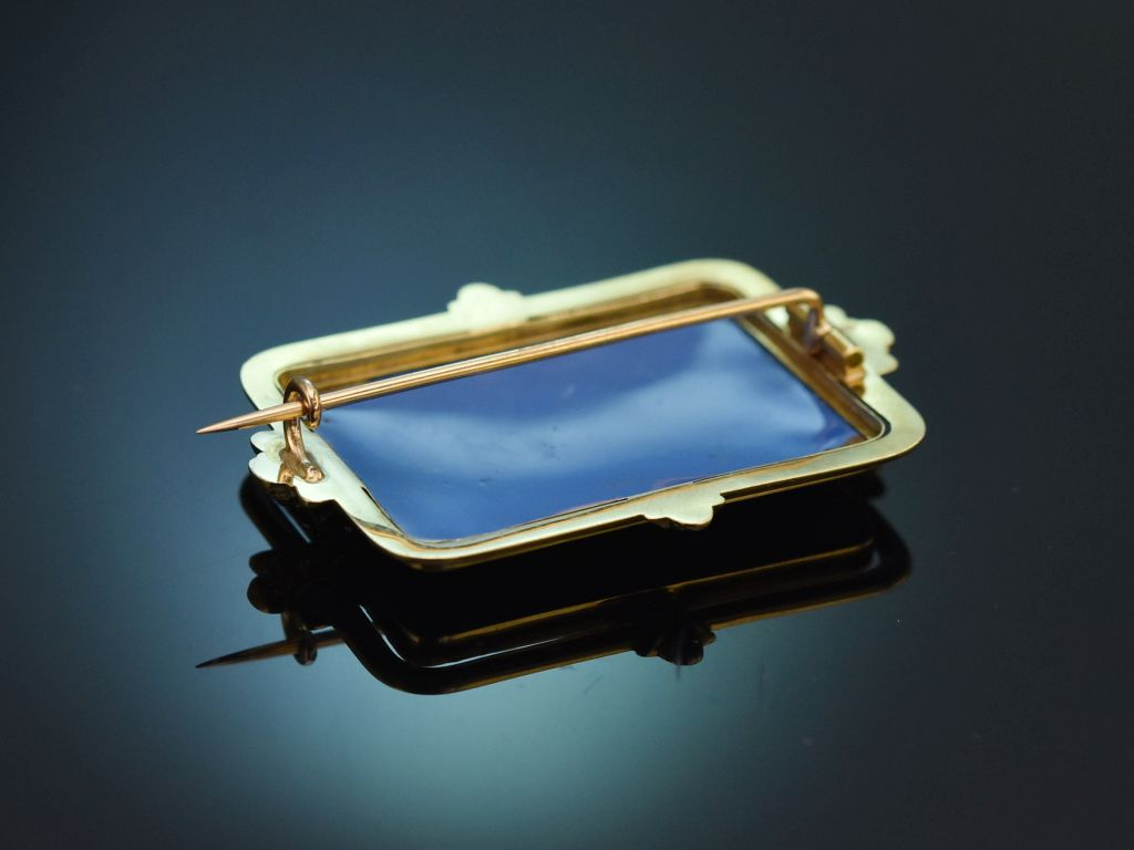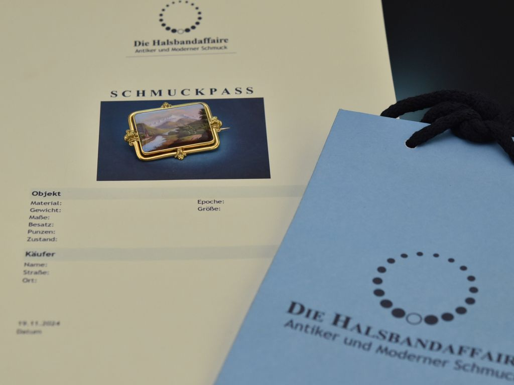 Die vorliegende Brosche knüpft an diese Tradition der Genfer Emaillemalerei an und entstand um 1860. Sie ist ein besonderes Sammlerstück, das zudem durch seinen hervorragenden Erhaltungszustand überzeugt.