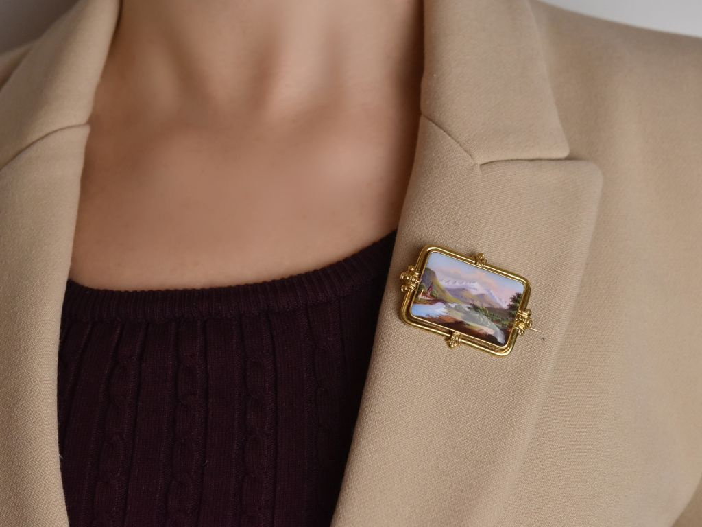 Diese Art von Broschen mit Genfer Emaille, die wie miniaturisierte Gemälde gestaltet wurden, dienten als tragbare Souvenirs der Alpenwelt. Fein handbemalt zeigten sie typische Schweizer Landschaftsidyllen mit Bergen, Kirchen und Flüssen, um Heimatverbundenheit und Reisekultur zu reflektieren und waren im 19. Jahrhundert ein beliebtes Reisemitbringsel oder Andenken an die Schweiz. Diese Stücke verbinden kunsthandwerkliche Präzision mit romantischer Landschaftsmalerei im Miniaturformat und sind hoch bewertet – damals wie heute.