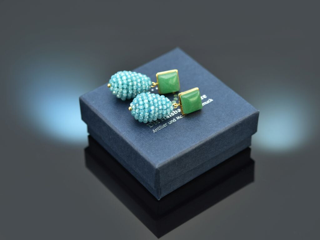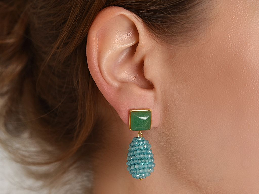 An quadratischen Brisuren besetzt mit grünen Achatcabochons schwingt je ein gefädelter Tropfen aus facettierten Zirkonkügelchen in strahlendem Blau. Praktische Butterfly-Verschlüsse sorgen dafür, dass der Ohrschmuck nah und sicher am Ohr sitzt.