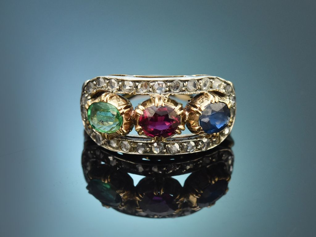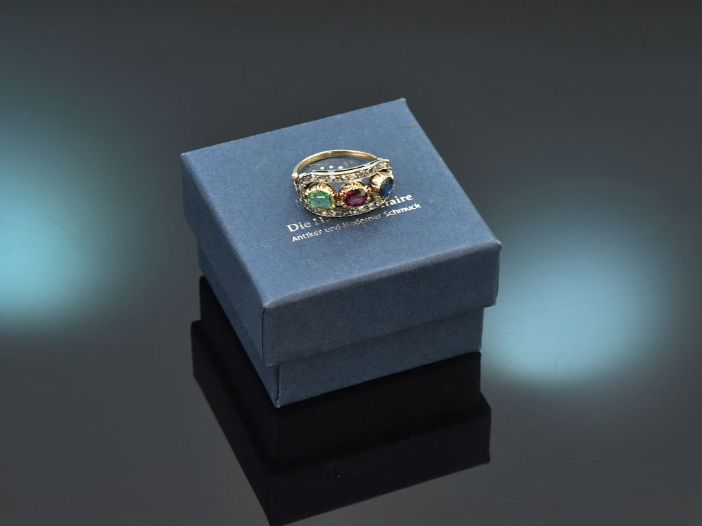 Seltener historischer Ring mit Smaragd, Rubin, Saphir und Diamanten, gearbeitet aus Gelbgold 750 / 18 Kt und Silber (geprüft und garantiert).