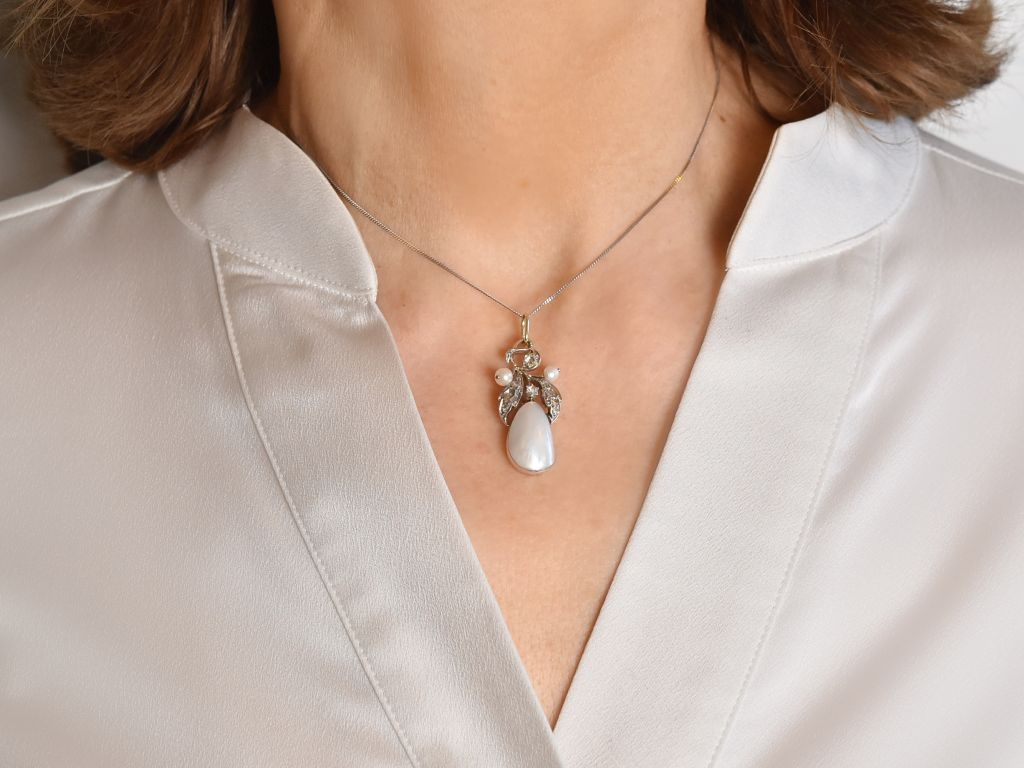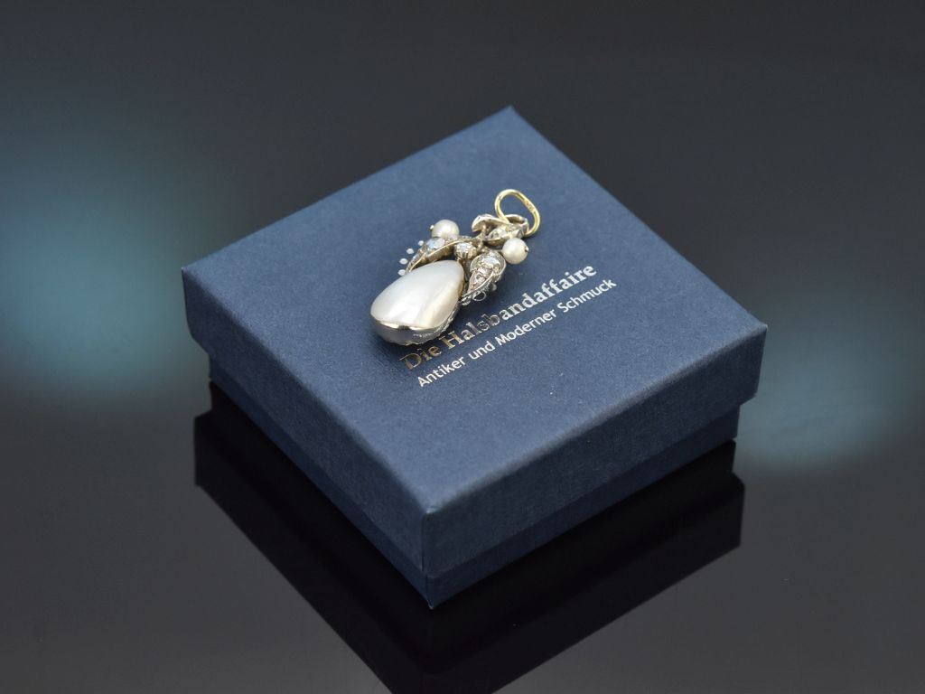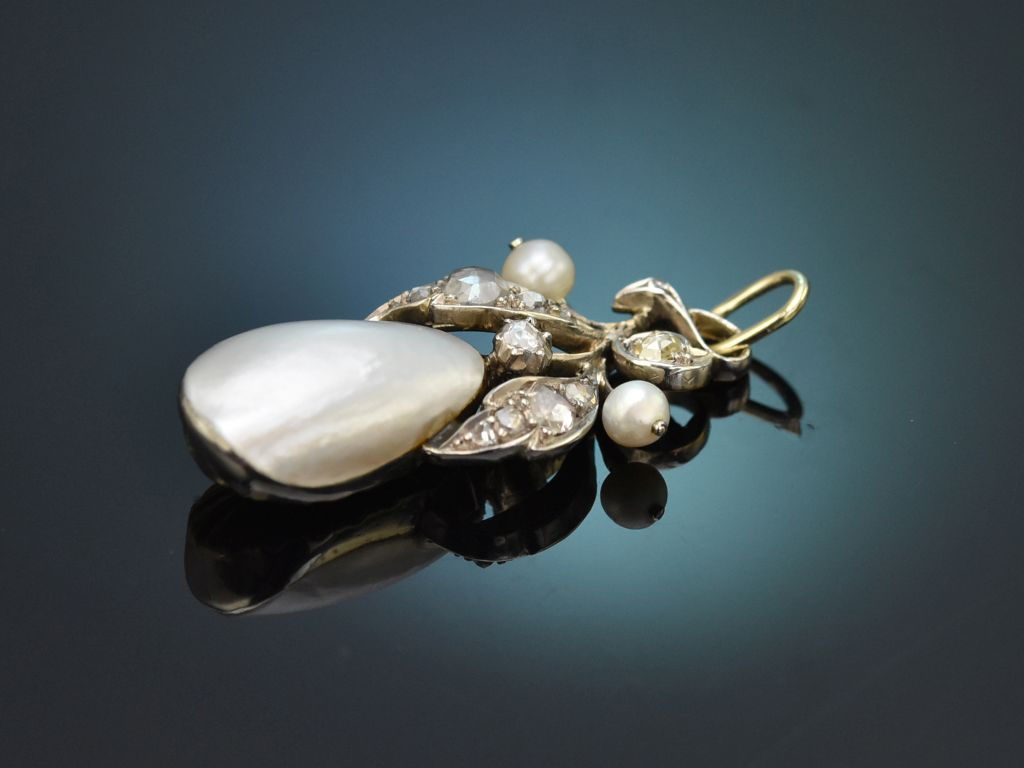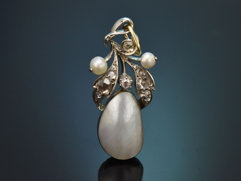 Der längliche Anhänger setzt sich aus einem floralen Motiv zusammen und kommt einem apart geschwungenen Ast mit feinem Blattwerk gleich. Wie kleine Tautropfen sitzen auf den Blättern zwölf wunderschön funkelnde Diamantrosen mit einem Steingewicht von zus. ca. 0,45 Carat. Dazwischen setzen zwei runde Naturperlen charmante Akzente und leiten auf eine große tropfenförmige Halbperle im Zentrum des Schmuckstückes über, die in einer sicheren Zargenfassung sitzt und durch ihren schönen weißen Lüster, ihre interessante, ebenmäßige Oberflächenstruktur und ihre Größe besticht.
