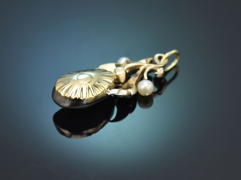 Seltener historischer Anhänger aus Diamanten und Naturperlen sowie Gelbgold 585 / 14 Kt und Silber (gestempelt, geprüft und garantiert).