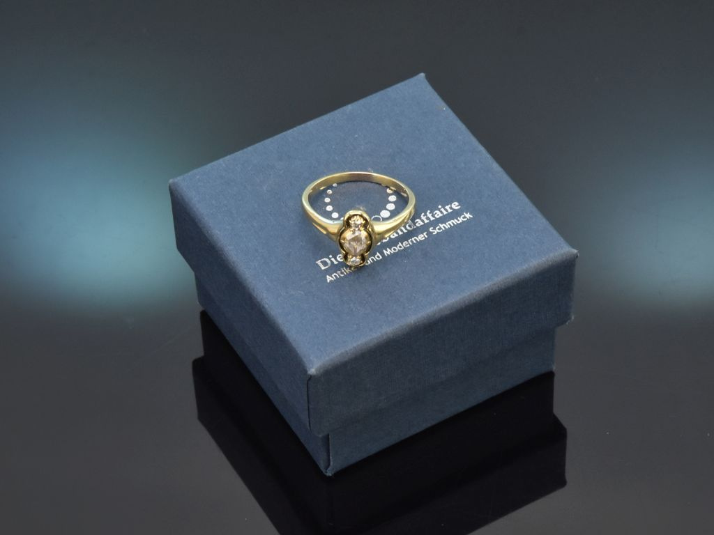 Der längliche Ringkopf ist in hochovaler, geschwungener Form gearbeitet und präsentiert mittig eine große und zwei kleinere Diamantrosen, die untereinander angeordnet sind. Die funkelnden Diamanten von zus. ca. 0,28 Carat sitzen in einer sicheren Zarge mit angedeuteten Krappen (sogenannten Stotzenfassung) und werden durch den Ringkopf kunstvoll umschlossen.