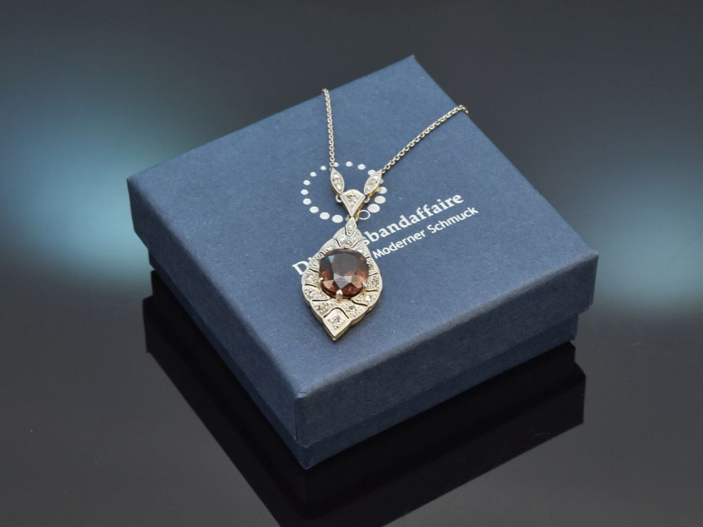 An einer Ankerkette aus Platin sitzt ein spitz zulaufender Anhänger aus Gelbgold mit Platinauflage. Der schöne Anhänger ist mit einem großen, rotbraun funkelnden Zirkon in Ovalschliff von ca. 7,9 Carat besetzt, der umspielt wird von durchbrochenem, ornamental gebildetem Millegriffedekor und zwölf funkelnden Diamantrosen. Drei weitere Diamantrosen finden sich an der zum Entwurf passenden Aufhängung, die den Anhänger mit der Kette verbindet.