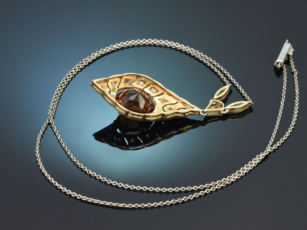 An einer Ankerkette aus Platin sitzt ein spitz zulaufender Anhänger aus Gelbgold mit Platinauflage. Der schöne Anhänger ist mit einem großen, rotbraun funkelnden Zirkon in Ovalschliff von ca. 7,9 Carat besetzt, der umspielt wird von durchbrochenem, ornamental gebildetem Millegriffedekor und zwölf funkelnden Diamantrosen. Drei weitere Diamantrosen finden sich an der zum Entwurf passenden Aufhängung, die den Anhänger mit der Kette verbindet.