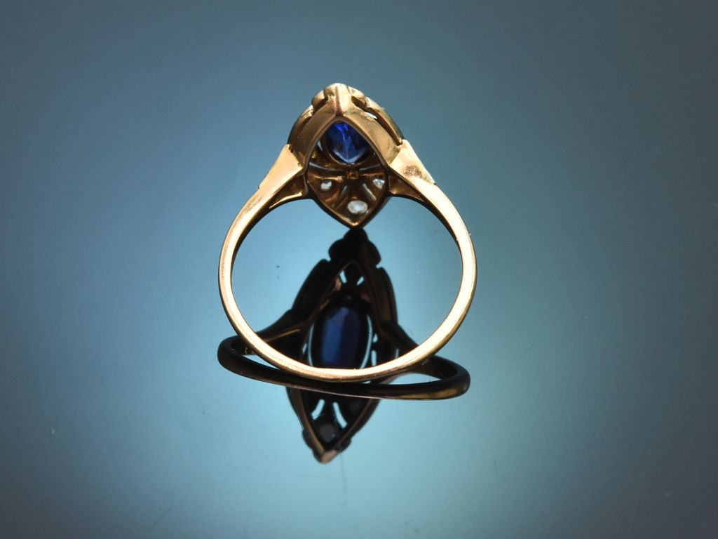 Der festliche und elegante Ring ist mit seinen verwendeten Materialien und seiner Formensprache noch ganz im Stil der Belle Époque gearbeitet. Er besticht aber vor allem durch den wunderschönen Saphir. Saphire aus Ceylon, dem heutigen Sri Lanka, gehören zu den wertvollsten und gesuchtesten Edelsteinen. Die Kombination aus speziellem Muttergestein und den farbgebenden Substanzen wie z. B. Eisen und Titan sorgt für die außergewöhnlich intensive blaue Farbe.