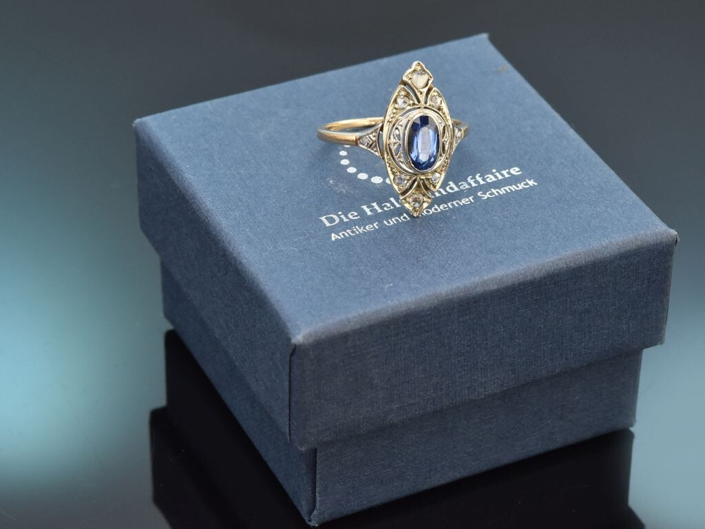 Feiner historischer Ring mit Ceylon-Saphir und Diamanten, gearbeitet aus Gelbgold 585 / 14 Kt und Platin (gestempelt und garantiert).