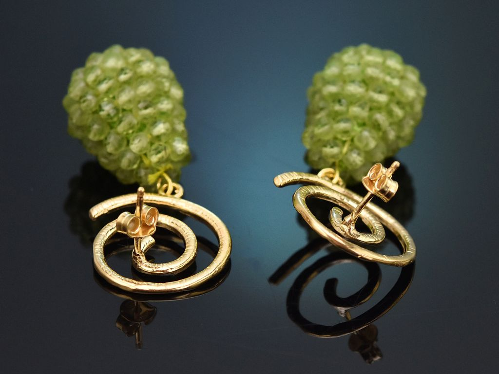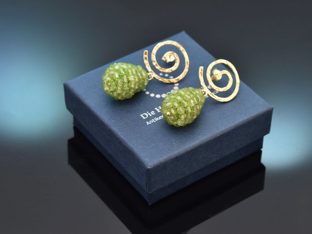 Die charmanten Ohrringe stammen aus unserer Werkstatt und bestechen durch ihren schönen Entwurf und die Harmonie der goldfarbenen Brisuren mit dem weichen Grün des Peridots.