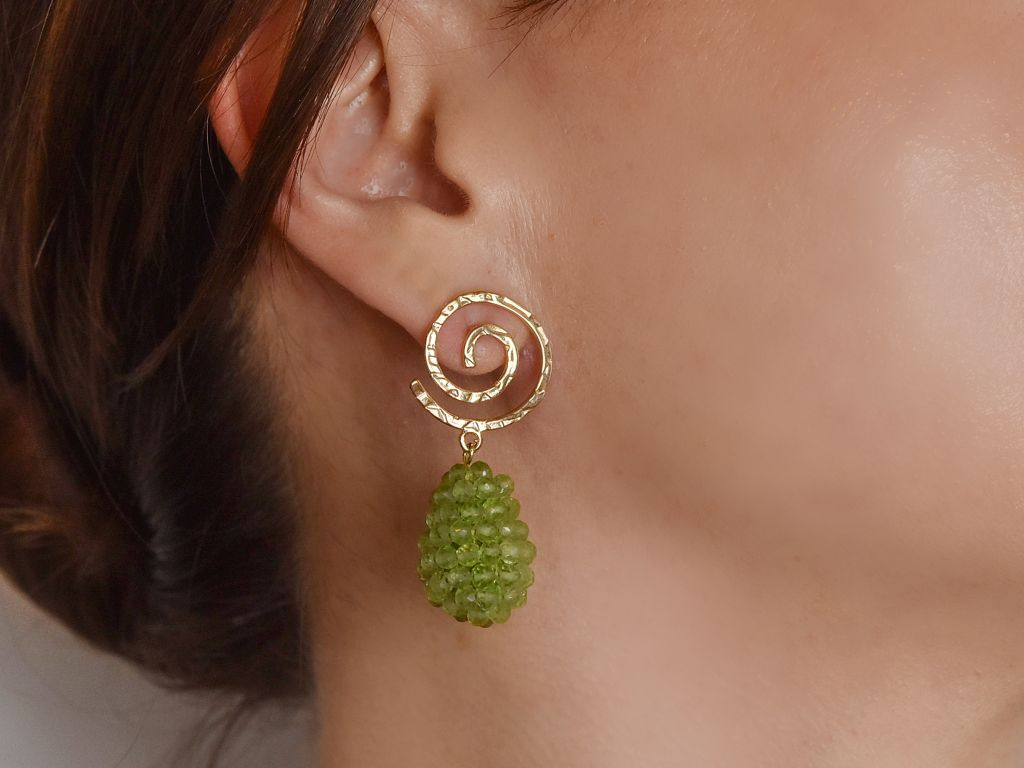 An spiralförmig gearbeiteten Brisuren in gehämmerter Optik schwingt je ein gefädelter Tropfen aus schönem, grasgrünen Peridot. Die praktischen Butterfly-Brisuren erleichtern das An- und Ablegen des Ohrschmuckes und gewährleisten einen sicheren Halt.