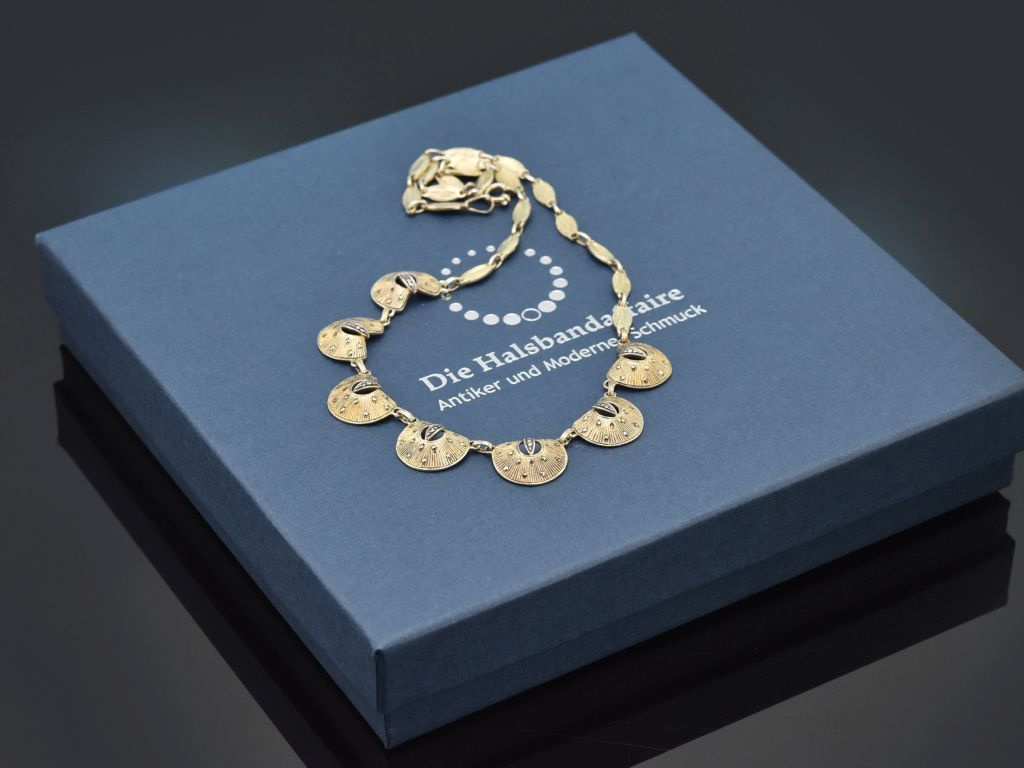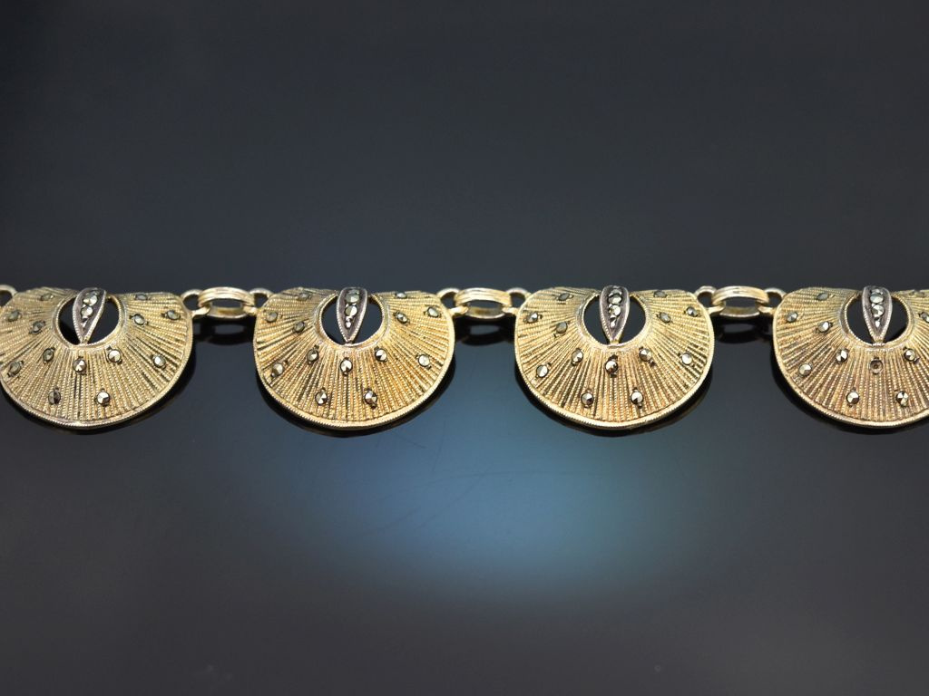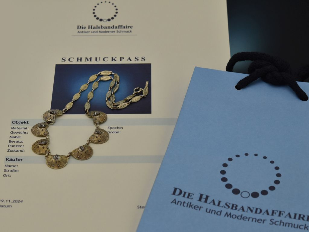 Die schöne Kette besteht aus kleinen spitzovalen Gliedern, die mittig in acht gewölbte Zierelemente übergehen, die durch ihre fächerartige Form an kleine Muscheln erinnern. Kleine funkelnde Markasiten setzen feine Akzente und verleihen dem Collier zusätzliche Raffinesse. Jedes Kettenglied ist darüber hinaus mit feinster zeittypischer Prägearbeit verziert.