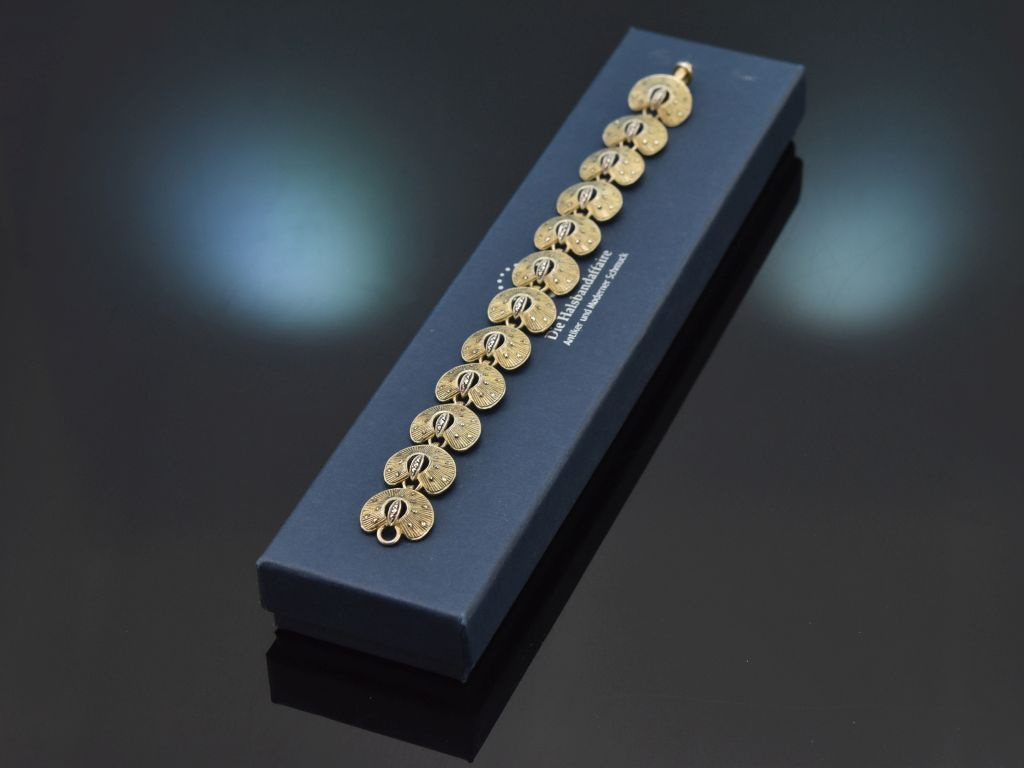 Das weich fließende Armband besteht aus zwölf beweglichen Gliedern, die durch ihre gewölbte, fächerartige Form an kleine Muscheln erinnern. Jedes Glied ist mit feinster zeittypischer Prägearbeit und mit metallisch funkelnden Markasiten dekoriert.