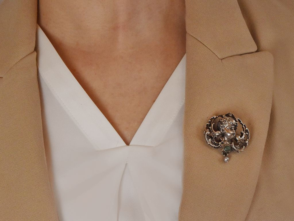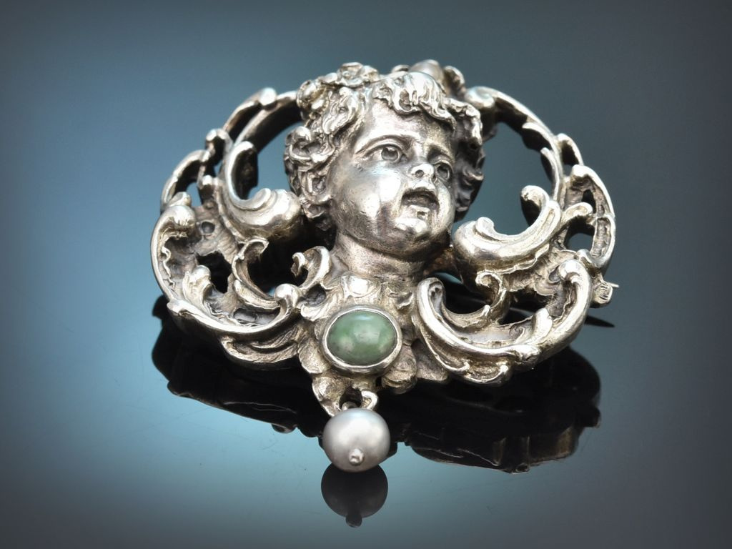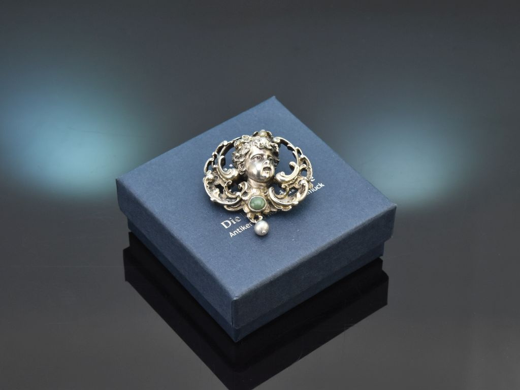 Die aparte Brosche zeigt einen Putto mit blütengeschmücktem lockigen Haar, dessen stilisierte Flügel aus Rocaillen und Schweifwerk bestehen. Ein Türkis-Cabochon auf der Brust des Puttos sowie zwei kleine Perlen setzen verspielte Akzente.