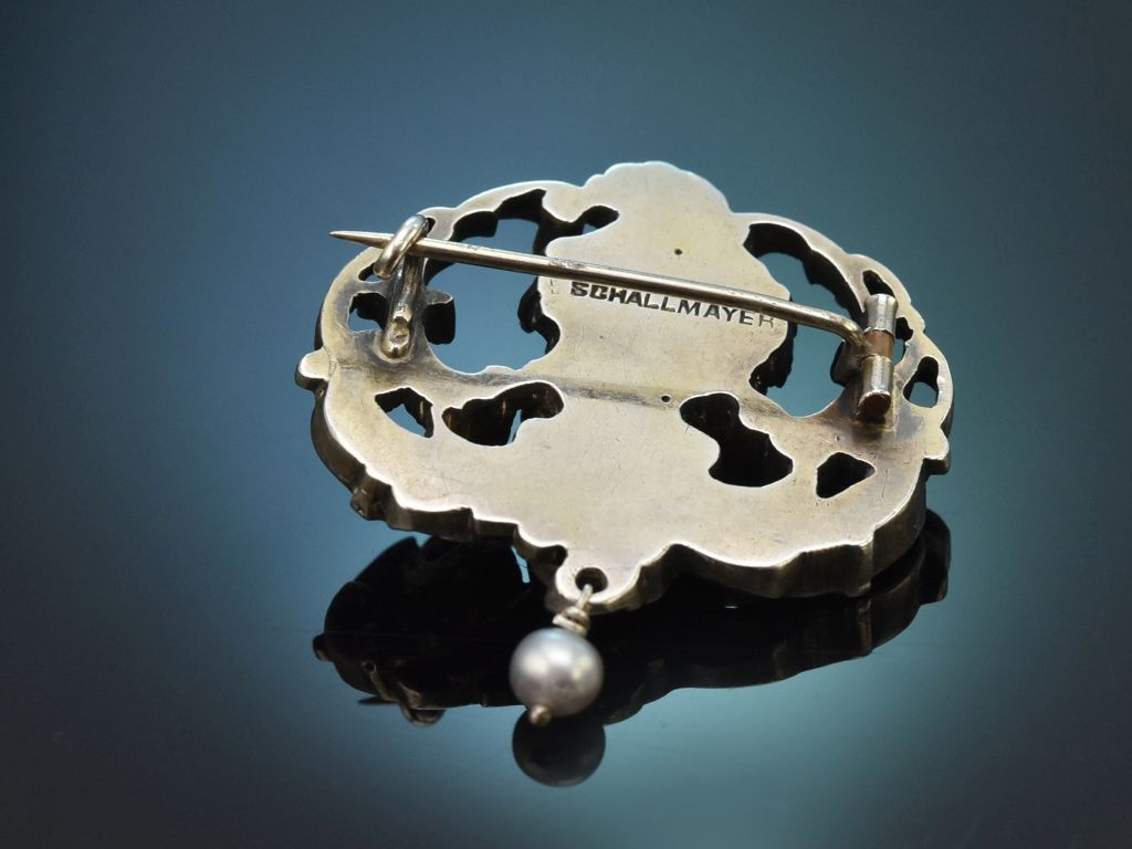 Die liebenswerte Brosche entstand um 1890 in München und stammt aus dem Hause des königlich bayerischen Hoflieferanten Theodor Schallmayer, der insbesondere für seine Schmuckstücke im Stil der Renaissance und des Rokoko bekannt wurde. Die Brosche ist somit nicht nur ein interessantes Sammlerstück, sie kann auch hervorragend zur Tracht und zum klassischen Stil kombiniert werden.