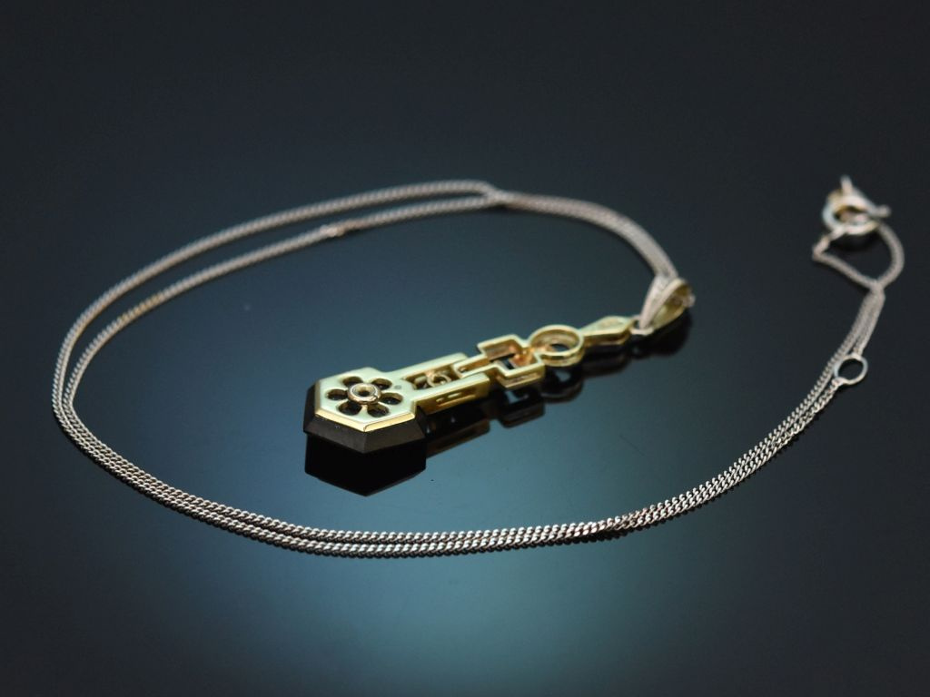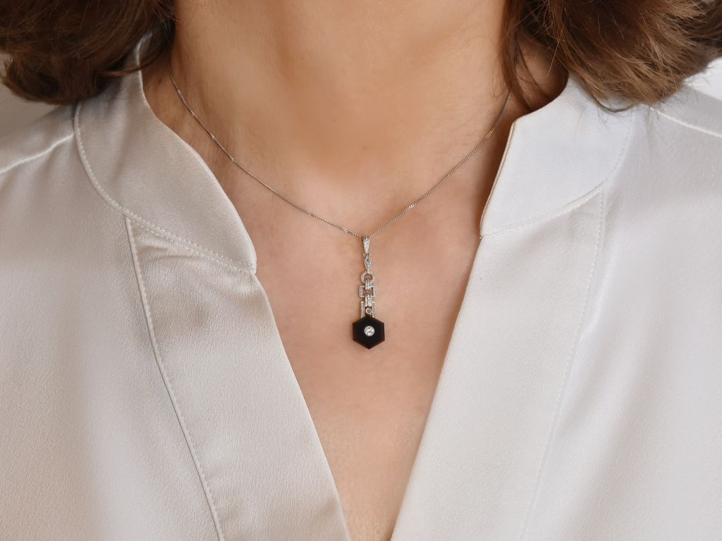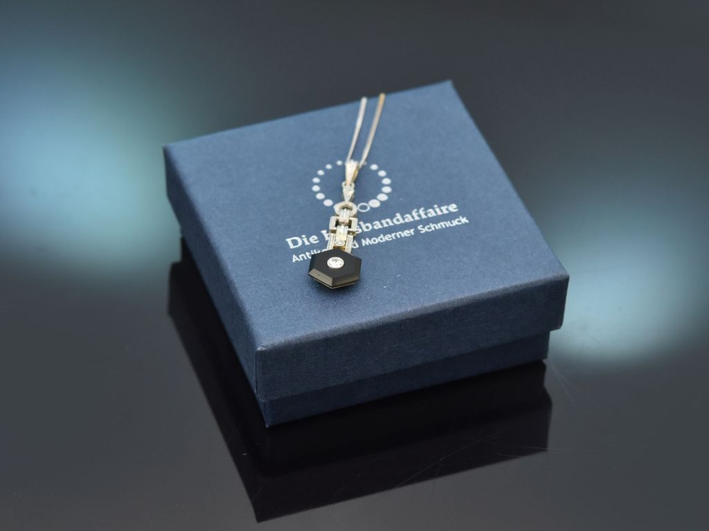 Der feine, längliche Anhänger besteht aus einem Aufbau von klaren geometrischen Formen, die auf einer Platinauflage ein zartes Dekor aus Millegriffes aufweisen. Am Ende ist eine sechseckige, schwarz glänzende Onyxscheibe befestigt, in deren Zentrum ein funkelnder Diamant in Übergangsschliff sitzt. Zwei weitere Diamantrosen sind in dem architektonischen Aufbau mit integriert. Die Diamanten haben zusammen ein Steingewicht von ca. 0,1 Carat und liegen im guten Qualitätsbereich (H-I, SI1-SI2).
