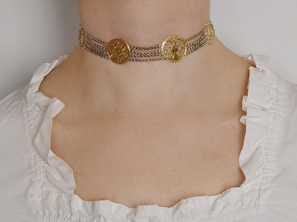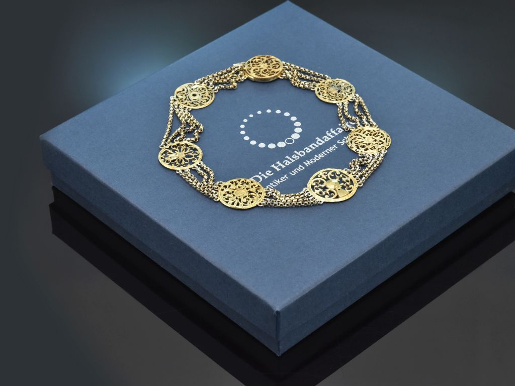 Die außergewöhnliche Kropfkette setzt sich aus vier Reihen feiner Silber Erbsketten zusammen, die von sechs historischen feuervergoldeten Spindelkloben kunstvoll unterbrochen werden. Ursprünglich dienten Spindelkloben als Gegenlager in deutschen und englischen Spindeltaschenuhren und schützten zugleich die empfindliche Unruh. Vom 17. bis ins 19. Jahrhundert wurden sie aufwendig mit Gravuren, ornamentalen Verzierungen und reliefartigen Durchbrüchen gestaltet.