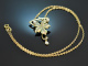 An einer Ankerkette aus Gelbgold 750 / 18 Kt (gestempelt und garantiert) sitzt ein dreieckig geformter Anhänger, der einem Ast nachempfunden und mittig mit einem realistisch geformten Weinblatt dekoriert ist. Das goldene Blatt ist mit feinem, grünlich schimmerndem Transluzidemail überzogen, seine Blattadern werden von 19 kleinen Diamantrosen geschmückt. Die Diamanten haben ein Steingewicht von zus. ca. 0,1 Carat und sorgen für einen dezenten Glanz.