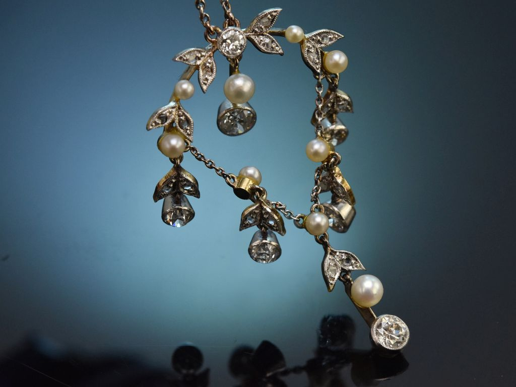 An einer feinen Ankerkette aus Weißgold 585 / 14 Kt sitzt ein zeittypischer Anhänger, der sich aus floralem Blattwerk und weich schwingenden Pendeln zusammensetzt. Kleine, mit Diamantrosen besetzte Blättchen wechseln sich mit weiß schimmernden Saatperlen ab und schaffen einen wundervollen Übergang zu sechs frei schwingenden Abhängungen, deren Enden mit größeren Altschliffdiamanten von zus. ca. 1,17 Carat (H-L, SI1-SI2) besetzt sind. Zusammen mit den restlichen verarbeiteten Diamanten kommt das Schmuckstück auf ein Steingewicht von insgesamt ca. 1,38 Carat.