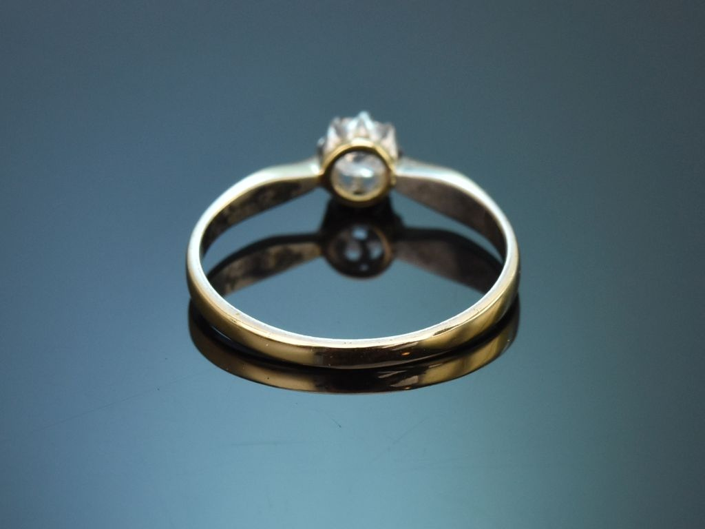 Historischer Verlobungsring mit einem Altschliffdiamant-Solitär, gearbeitet aus Gelbgold 585 / 14 Kt (geprüft und garantiert).