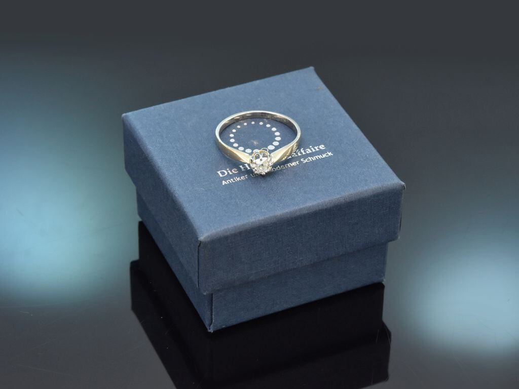 Den schlichten Ringkopf ziert ein funkelnder, krappengefasster Altschliffdiamant von ca. 0,25 Carat. Der Diamant liegt im sehr schönen Qualitätsbereich (G-H, VS1-VS2).
