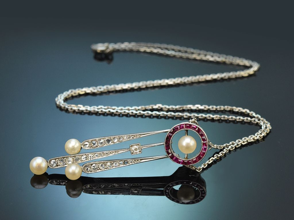 Das klassische Kreiselement ist vollständig ausgefasst mit 22 kalibriert geschliffenen Rubinen von zus. ca. 0,22 Carat. Die in wunderschönem Rot funkelnden Edelsteine umschließen eine in sanftem Cremeweiß schimmernde Naturperle. Drei schmale, beweglich angehangene Pendel bilden den Abschluss des Anhängers und sind mit insgesamt 25 feinen Diamantrosen von zus. ca. 0,30 Carat und drei weiteren Naturperlen mit cremeweißen Lüster besetzt.